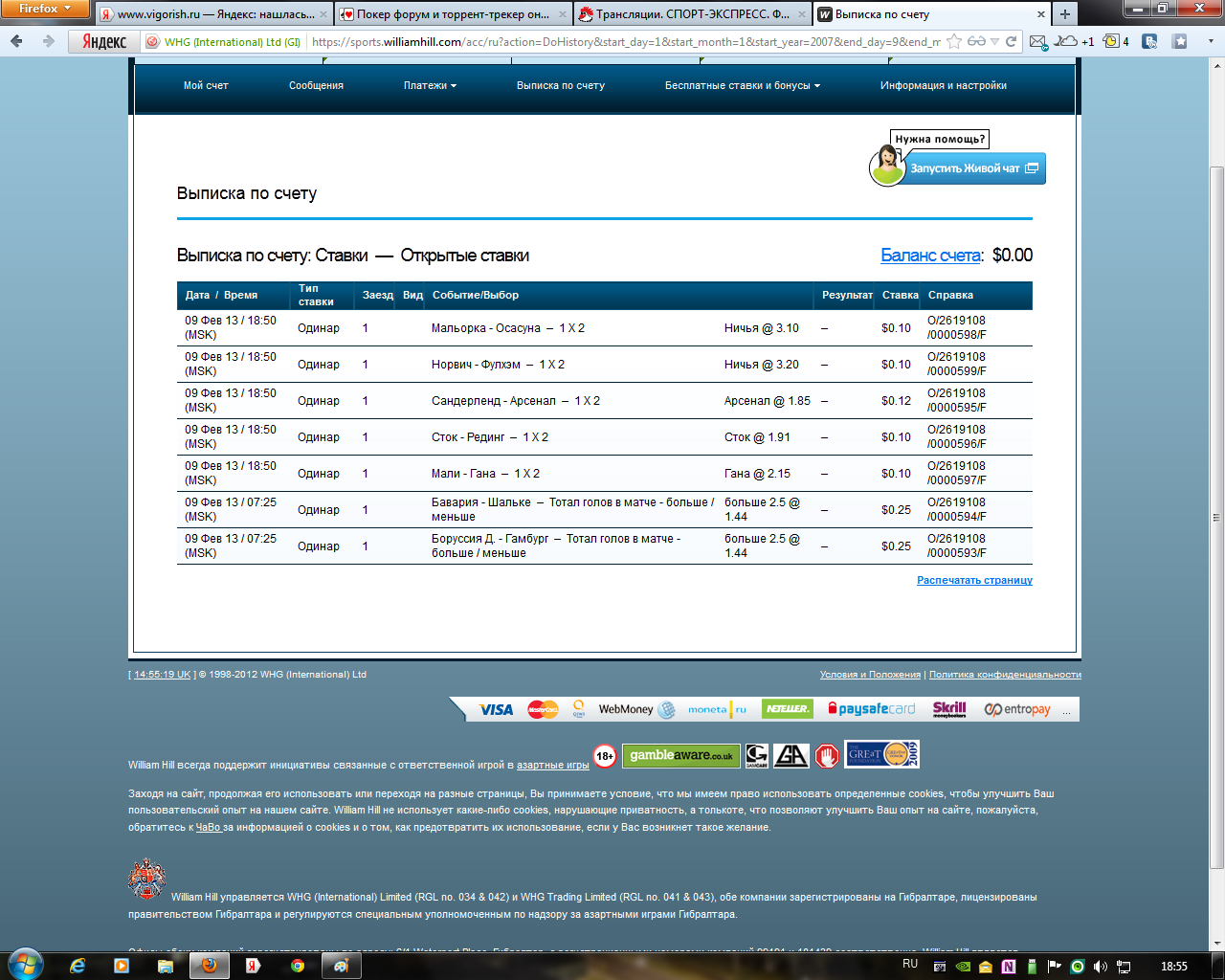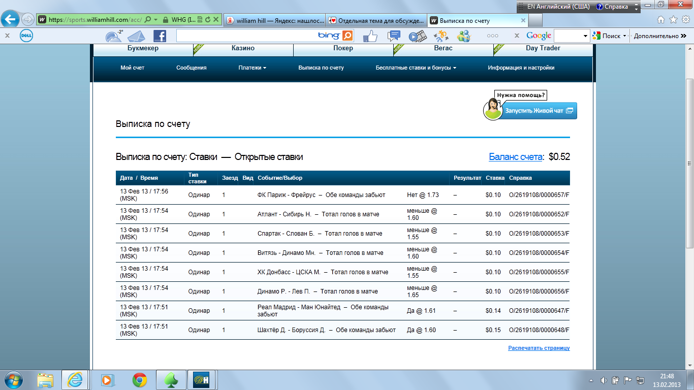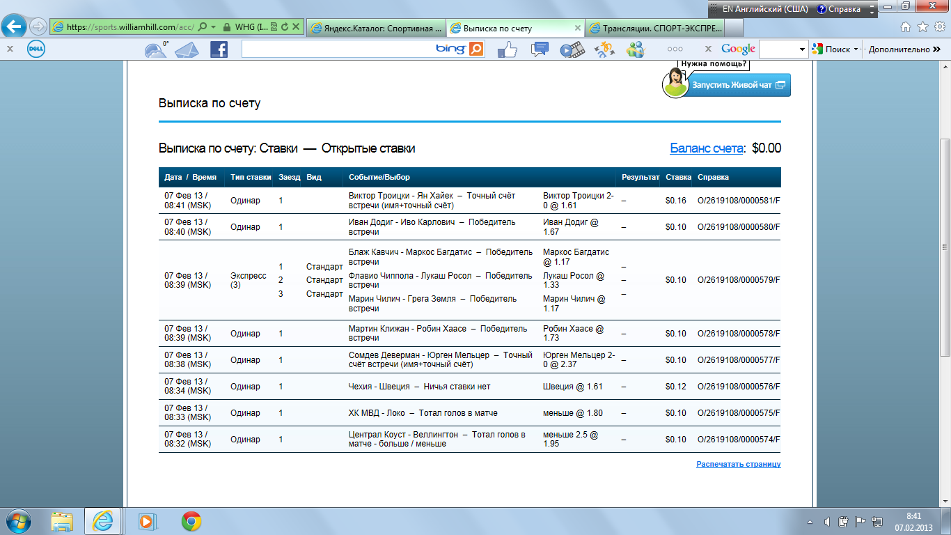 13.02.13 18:52 Ставка №18 экспреcс (кф. 8.37) Сумма: 20 usd (возможный выигрыш: 167.4 usd ) дата события событие ставка кф результат 13.02.13 23:45 Шахтер Дн - Боруссия Д 1 2.7 13.02.13 23:59 Давыденко Н. - Димитров Г. 2:0 3.1 http://www.betonsuccess.ru/sub/5393/Ten ... stats/all/
