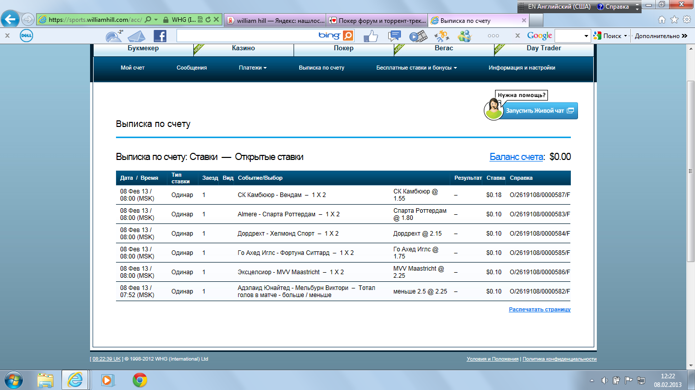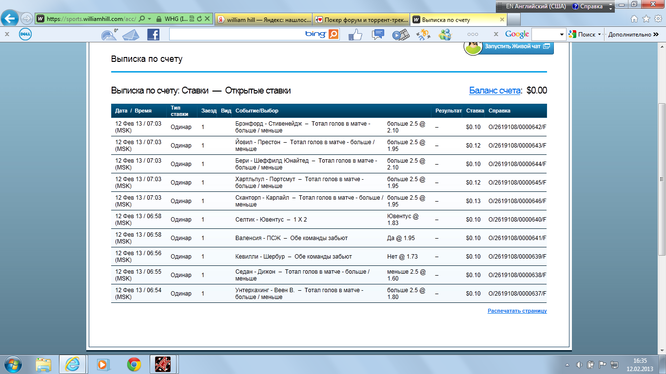 13.02.13 00:31 Ставка №15 Одиночная Сумма: 13.42 usd (возможный выигрыш: 52.34 usd) дата события событие ставка кф результат 13.02.13 12:00 Квитова П. - Макарова Е. 0:2 3.9 http://www.betonsuccess.ru/sub/5393/Ten ... stats/all/