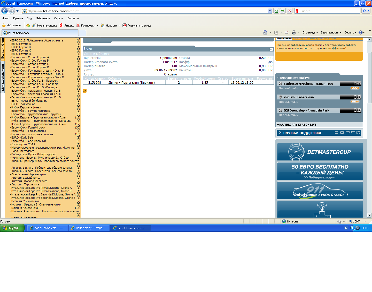 2)Не считаю Данию хорошей командой-хотя после сегодняшних матчей окажется,что я облажался.Ну а если Дания сегодня проиграет-то и кэф на португальцев упадёт.Занимаем места