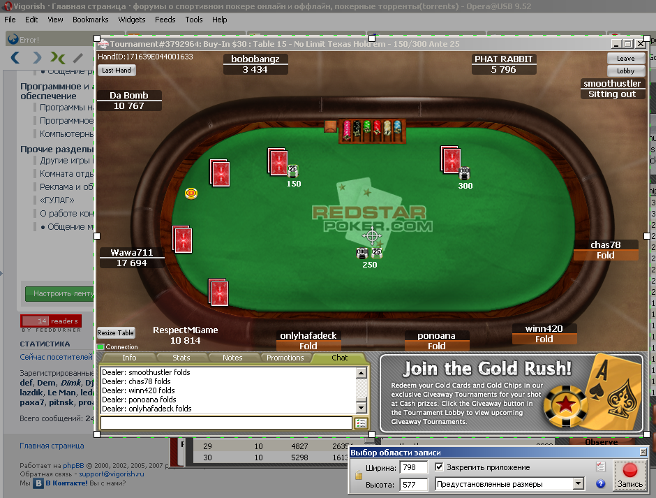 VOD (Video On Demand, "видео на лету" или "видео по запросу" - с англ. ) по игре в клубный покер на компьютере - это видео файл с записью игры. Есть два вида VOD’ов: обычные и от первого лица. Обычные воды представляют собой просмотр игры в качестве зрителя, что не сильно отличается от простого просмотра реплея. Такие видео файлы не пользуются популярностью в покере, но имеют некий спрос в таких играх как Warcraft и Starcraft. Вторая разновидность VOD’ов - от первого лица - представляет гораздо большую ценность, ведь в нем записано именно то, что видел на своем мониторе и какие действия совершал игрок, от лица которого записывался VOD. Ценность подобных роликов заключается в том, что, в отличие от реплея, вы можете проследить за всеми находками и ошибками игрока. Если записанная игра велась на нескольких столах, то можно увидеть каким столам отдавался больший приоритет. Обычно VOD'ы сопровождаются голосовыми комментариями, что увеличивает ценность видео во много раз, и позволяет использовать его в обучающих целях. Еще один из плюсов - это возможность запуска без установленного клиента покерного рума - соответственно, исчезает разница между разными покерными залами. Пример, одной из самой популярной на Вигориш сборок VODов -> /forum5/topic154-20.html?hilit=vod Как можно записать VOD? Программ для записи VODов существует много, но лучшая в свое классе - Camtasia Studio (http://www.techsmith.com) Стоимость программы на момент написания статьи - $299. Интерфейс - английский. Для тех, кто пока не может приобрести программу и плохо знает английский язык рекомендую скачать вот этот вариант программы: /forum61/topic1593.html Именно на примере работы с этой версией Camtasia Studio будет рассказано, как правильно записать VOD. Краткий экскурс в возможности программы можно почитать на сайте 3dnews.ru: http://www.3dnews.ru/software/camtasia_studio_5_1/ Итак, нам понадобится: 1. Программа для записи VODов - Camtasia Studio; 2. Хороший кодек, который сожмет наше видео. О том, что такое кодек, можно почитать тут -> http://ru.wikipedia.org/wiki/Кодек В качестве кодека будем использовать: Xvid (x86/x64) (ранее «XviD») — библиотека сжатия видео стандарта MPEG-4. Как правило этот кодек поставлятся в составе таких популярных сборников кодеков как K-Lite Codec Pack (http://www.codecguide.com) и т.д. Если на вашем компьютере она не установлена, то вы можете скачать её или прямо с Вигориш: или с сайта русской поддежки: http://www.xvidvideo.ru После успешной установки кодека и Camtasia Studio запускаем последнюю. Теперь нужно провести некоторые настройки программы. Я предлагаю использовать уже подготовленный мною профиль для записи VODов. Скачать его можно тут: После скачивания запишите этой файл в директорию [C:\Documents and Settings\admin\Мои документы]\Camtasia Studio\Другие профили 5.0 (часть адреса в квадратный скобках может быть другой, уточните этот момент на своем компьютере). В итоге вы должны видеть приблизительно следующее: Опытные пользователи смогут посмотреть и перенастроить этот профиль, ну а мы пока идем дальше. Возвращаемя к нашей программе. Далее жмем на "Новая запись экрана": Если у вас появилось вот это окошко: жмите "ОК". Теперь нужно выбрать, что и как будем писать: Если Ваш VOD будет без звукового комментария - уберите галочку "Микрофон". Запускаем свой покерный клиент. Я запустил клиент рума RedStarPoker.com: Далее я зашел в первый попавшийся турнир и перешел к столу в режиме наблюдателя. Возвращаемся к нашему окошку упралению записью и жмем на кнопку "Выбор обл
