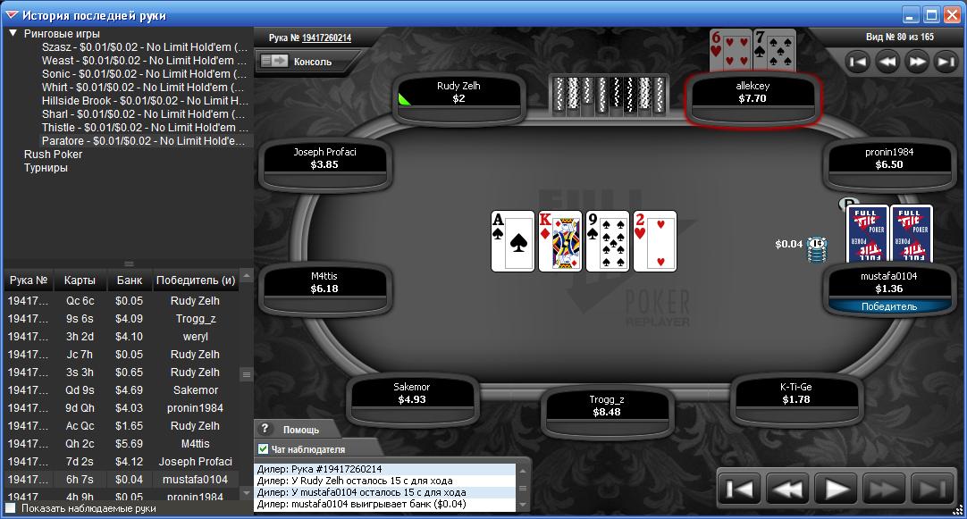 Ну так правильно. Взяли в одном месте полтинники, слили одному своему другу и сразу же ушли в другие румы. Будь я в СБ рума я бы его тоже забанил. У тя же случай другой. Какой то чел просто развлекался, собирая толпу игроков за столом. Так мы, блин, додумаемся до того, что главный заливщик высоких лимитов россиянин scout315 это на самом деле русский "кардер" проф. игрок PositiveIQ http://www.pokertableratings.com/party- ... h/scout315 Последний раз редактировалось stock 21 мар 2010, 19:50, всего редактировалось 1 раз.