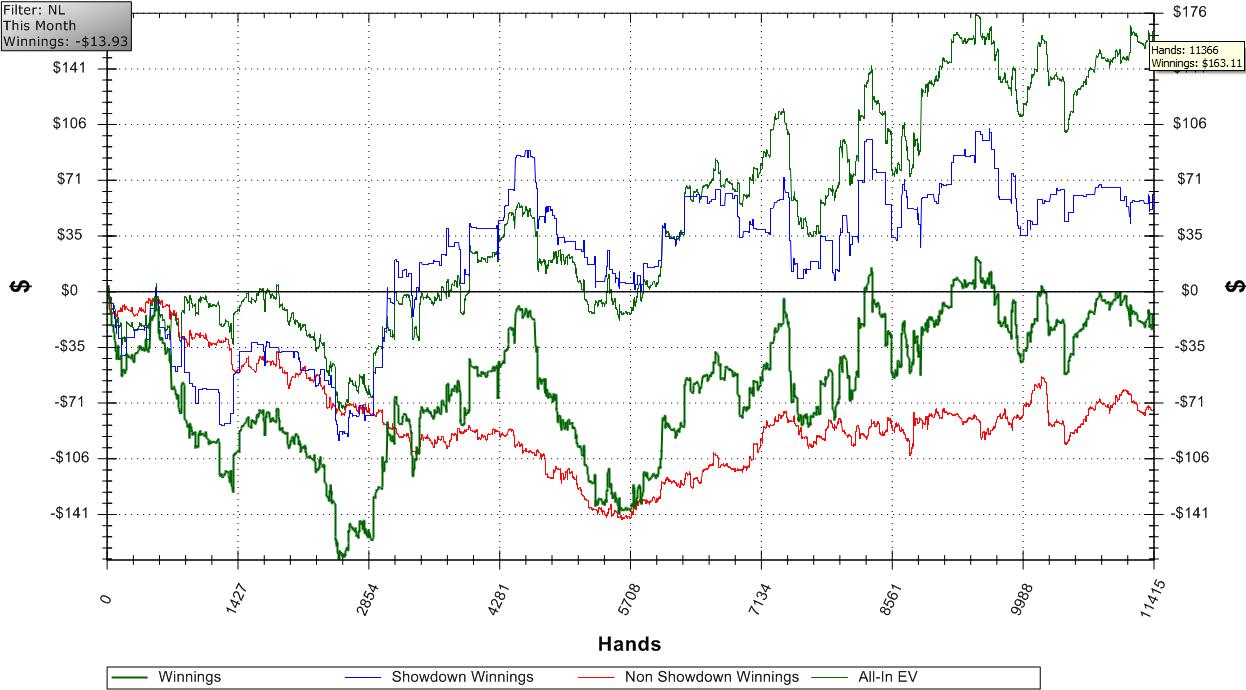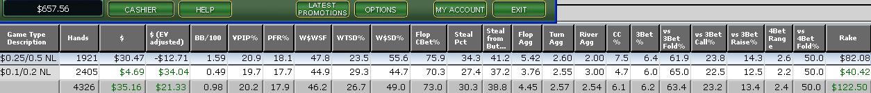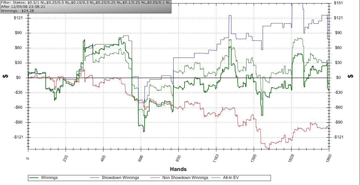 Мне 22 года, не работаю, не учусь. Играю ровно год. Никаких высот в покере не достиг из-за постоянных крупных кэшаутов и ещё по кое каким факторам. Играю сейчас лимит NL50 в сети Entraction (B2B). Винрейт что то около 3.5-4PTBB/100. Ближайшая цель - полный переход на лимит NL100 при достижении отметки банкролла в 5000Euro. Время перехода на NL100 - до 1.12.2008. В принципе, за октябрь должен получиться рейкбек в районе 1к евро, поэтому наиграть необходимо не так уж и много. Банкролл 3027 Euro Enjoy! Последний раз редактировалось cartman 23 апр 2010, 21:30, всего редактировалось 1 раз.