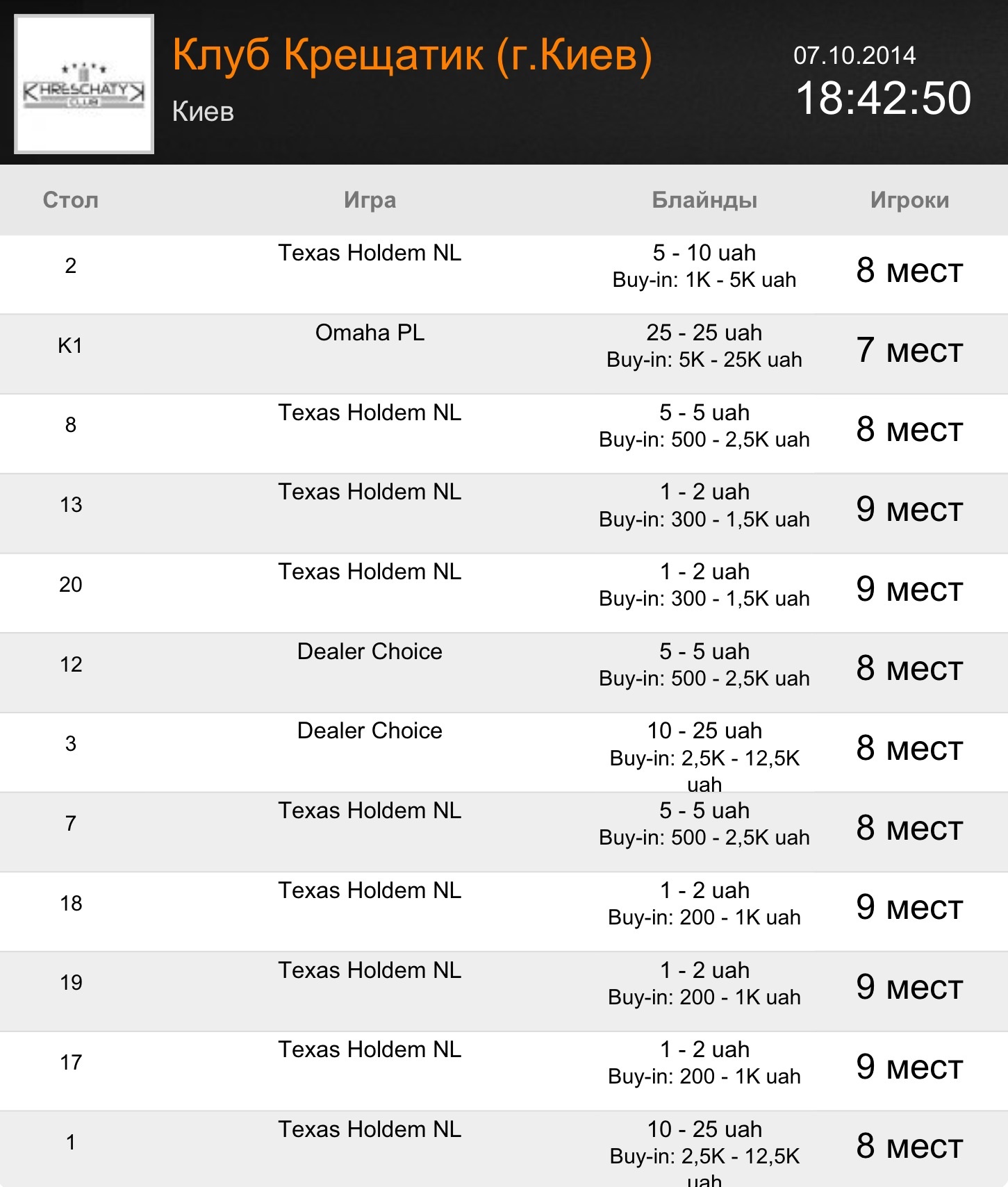 У нас уже играет 7 столов кеша. 4 стола 1-2 2 стола 5-5 1 стол 5-10