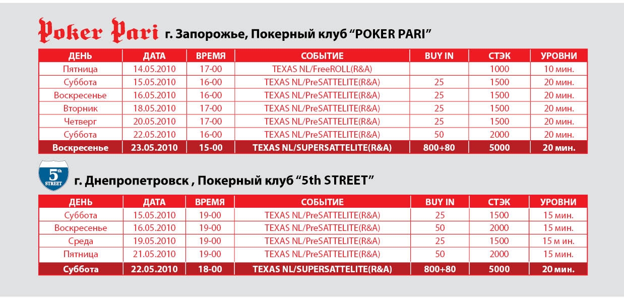 БОЛЬШАЯ просьба оставлять информацию о клубах в таком виде: Название/логотип Адрес Станция метро/схема доезда/стоянка Телефон Режим работы Количество столов Турниры, рейтинг Кеш игра NL TexasHoldem / PL Omaha, лимиты Комисcия (рейк) Бар/ресторан режим работы ТВ Sport/www.tvpropoker.com "ON-LINE зона: к-во мест, доступные покеррумы, возможность играть со своего аккаунта" Wi/Fi интернет Видеонаблюдение Проживание пишите: pokerua@gmail.com Skype: ua-met Киев 10=12-2 город количество клубов=действующих-временно не работают М "Дворец спорта" М "Республиканский стадион" (станции метро зеленой и синей ветки) Киев 18=19-1 Информация по турнирам --> /section51/topic1114-20.html Клуб спортивного покера "Авалон" М "Университет" или "Театральная" ул.Леонтовича 3 найти на карте --> http://maps.visicom.ua?c/30.5107:50.445 ... 4:50.4458/ 6 столов 044 234-71-96 жалобы и предложения 098-002-09-30 - Александр http://www.avalon.ua/cazino/ Покерный клуб "Арена" ул. Бассейная, 2а, ТРЦ "Арена" 2эт. http://maps.visicom.ua/?c/30.5107:50.44 ... :50.4458/# 044-492-00-04, 067-465-33-77 есть интересная омаха http://www.arena-kiev.com Клуб спортивного покера "Империал" М "Дворец спорта" М "Республиканский стадион" ул. Саксаганского 1г (слева НСК Олимпийский вверх по ступенькам) найти на карте --> http://maps.visicom.ua/?c/30.5107:50.44 ... :50.4458/# 205-53-90 244-39-57 On-line зона, много столов и разной игры http://www.imperial.com.ua/ Клуб спортивного покера "Крещатик" М "Майдан Независимости" ул.Крещатик, 14 найти на карте --> http://maps.visicom.ua?c/30.5237:50.447 ... 0:50.4515/ 044-596-80-40 WI-FI в номерах и холле гостиницы Лаунж-ресторан «Budda-bar» с изысканной кухней и оригинальным декором сети «Мировая Карта» Клуб спортивного покера "Хата рыбака" ул.Ревуцкого, 2 044-562-75-77 Клуб спортивного покера "Алабама" М "Нивки" проспект Победы, 84б (тыльная сторона ресторана «Тарас») найти на карте --> http://maps.visicom.ua/?c/30.5107:50.44 ... :50.4458/# На турниры собирается от 20 до 60 человек. Ведется постоянный рейтинг с разыгрыванием призового фонда. Каждый день кеш. Один-три стола. 1-2 дол. On-line зона 207-41-80 095-272-99-86 http://www.alabama.in.ua Клуб спортивного покера "Пиросмани" ул.Стеценко, 44 050-380-77-26 http://www.pirosmani-r.com.ua Покерный клуб «Торнадо» М "Дарница" ул.Малышко,1, гост. "Братислава", найти на карте --> http://maps.visicom.ua/?c/30.5107:50.44 ... :50.4458/# 067-404-633-4 549-19-18 http://www.tornadopokerclub.in.ua/ Покерный клуб "Poker Ring" М "Харьковская" ул. Тростянецкая, 4/2 найти на карте --> http://maps.visicom.ua/?c/30.5107:50.44 ... :50.4458/# 067-186-74-74 http://www.poker-ring.kiev.ua/ Клуб спортивного покера "ГРАНД ВИКТОРИЯ" М "Минская" ул. Маршала Тимошенко 29 найти на карте --> http://maps.visicom.ua/?c/30.5107:50.44 ... :50.4458/# 383-33-31 068-129-22-66 http://www.royalpoker.kiev.ua/ Клуб Спортивного Покера "Circolo" ул. Привокзальная, д. 14 станция Дарница найти на карте --> http://maps.visicom.ua/?c/30.5107:50.44 ... :50.4458/# 566-39-82 067-670-44-88 http://www.circolo.kiev.ua/ Клуб Спортивного Покера "Admiral" "Каравелла" Днепровская набережная, 2а 067-236-71-61 Клуб Спортивного Покера "Славутич" ул.Энтузиастов,1 "044-295-06-11 067-693-33-55" Клуб Спортивного Покера "Weekend" ул.Боженко, 107 (2-этаж) 067-501-42-42 Клуб Спортивного Покера "Сплит" ул. Прорезная, 8 "044-536-17-17 050-469-32-22 " http://www.split.kiev.ua/ Покерный клуб "Саванна" ул. Анны Ахматовой 44 Левый берег найти на карте --> http://maps.visicom.ua/?c/30.5107:50.44 ... :50.4458/# 066-658-98-91 Покерный клуб "Европа" ул. Горького, 8 287-67-84 Покерный клуб "Мaэстро" М "Университет" ул.Хмельницкого, 53 найти на карте --> http://maps.visicom.ua/?c/30.5107:50.44 ... :50.4458/# 581-33-06, 581-33-05, 067-402-96-61 http://www.pokerclubmaestro.com Ситипокер ул. Нагорная, 20, оф.421 найти на карте --> http://maps.visicom.ua/?c/30.5107:50.44 ... :50.4458/# 483-05-74 кеш 1-2 грн. http://citypoker.com.ua/ клуб временно не работает Днепропетровск 9=9+/-? Покерный Клуб "Палуба" ул.Фучика 18 ( 3й этаж) тел. (0562) 46-62-42. Турниров нет или если