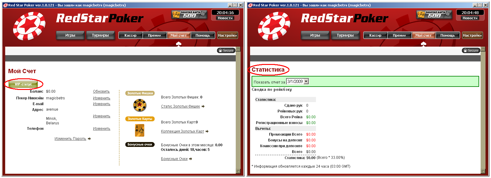 Red Star Poker - это возможность игры в покер с реальными игроками в режиме реального времени. Система покер-рума поддерживает как русский, так и английский языки, что позволяет играть в покер из любой страны мира. Различают две основные разновидности игры - "покер против казино" и "клубный покер". Покер в Red Star Poker - это игра между людьми, друг против друга, а не против дилера казино. У нас играют в различные виды покера: Техасский холдем, Омаха, Стад покер. Современный покер в интернете действительно удобен: достаточно изучить правила одной из разновидностей игры, например, Техасский Холдем и присоединиться к мировому сообществу игроков. На популярных покер-румах легко найти соперников любого уровня. В оффлайн покер клубах Вы зачастую вынуждены терпеть грубость игроков (к сожалению, в России пока таких покерных игроков немало), вдыхать табачный дым и т.д. В онлайн покер вы можете играть и дома, обеспечив себе максимально комфортные условия. В данный момент, благодаря развитию покера в интернете и появлению новых игроков в покер, а в России также благодаря признанию покера спортом, популярность игры в интернет покер-румах растет стремительными темпами. В Red Star Poker можно играть в покер бесплатно: начать тренировки на виртуальные деньги или сразу принять участие в бесплатных турнирах. Наша цель – предоставить вам лучшие возможности для игры в покер! Описание рума Red Star Poker Домашняя страница: http://ru.redstarpoker.com Покерная сеть: Cake Poker Network В среднем игроков онлайн: 4000-6000 Языковые версии клиентской программы и сайта: Английский, Русский Ввод/вывод денежных средств: Moneybookers, WebMoney, VISA/VISA Electron Метод начисления рейка: Dealt Мульти скриншот рума Предложение рума игрокам Vigorish Если вы хотите играть в Red Star Poker вместе с Vigorish, тогда вам необходимо при регистрации указать код приглашения ресурса "VIGORISH", ссылка перехода к регистрации: перейти к регистрации в Red Star Poker с кодом приглашения На рисунке показано, куда нужно вводить код приглашения ресурса: Если вы регулярный игрок в покер в Red Star Poker и хотите максимально увеличить свои доходы от игры, тогда вам нужно заглянуть в Предложение для профессиональных игроков в покер. На данный момент, вместе с Vigorish в Red Star Poker играет: 165(+8) пользователей! ![]() Игрокам Vigorish доступны сервисы - 110% БОНУС на первый депозит (максимально 600$), описание бонуса на сайте рума -> Бонусы; - 33% Рейкбека от рейка Red Star Poker, при условии регистрации с кодом приглашения ресурса "VIGORISH"; При правильной регистрации с кодом приглашения ресурса "VIGORISH" во вкладке "Мой счет" появится кнопка [VIP-статус]: При нажатии на кнопку [VIP-статус] можно попасть в раздел "Статистика" (см. пред. скриншот) и узнать о размере полученного Рейкбека. Если у Вас нет кнопки [VIP-статус] - пишите в Службу поддержки игроков Vigorish (см. ниже по тексту). - Турниры проводимые Red Star Poker, описание турниров на сайте рума -> Турниры; - Магазин сувениров от Red Star Poker, описание магазина на сайте рума -> Магазин сувениров; - Специальные предложения от Red Star Poker, описание предложений на сайте рума -> Специальные предложения. Служба поддержки Red Star Poker На Vigorish работает представитель Red Star Poker. Более подробная информация написана здесь -> http://www.vigorish.ru/section59/topic1224.html Телефон: 8 10 800 257 53 011 (звонок бесплатный со стационарных телефонов для всех регионов России) Если Вы находитесь за пределами России, напишите на электронную почту support@red