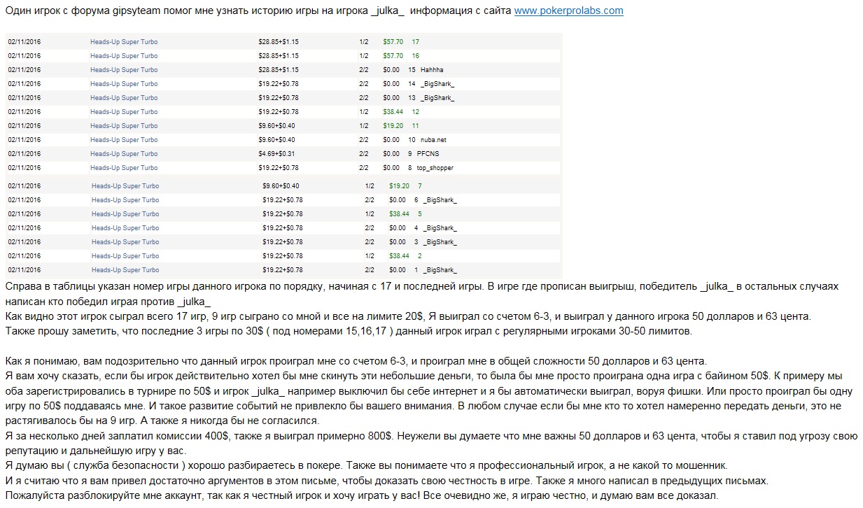 Maxim, спасибо за Ваш ответ и за звонок в компанию. В продолжение нашего телефонного разговора, сообщаю. что я пересылаю Вашу информацию на рассмотрение в операционный отдел вместе с информацией, которую Вы сообщили мне: " Ник, связанный с дампом, первый и последний символ совпадает с Вашим. Вы думаете, что Вас преднамеренно подставили, т.к. Вы сильный игрок. Тот, кто Вам проигрывал, проигрывал преднамеренно, для того, чтобы Вас подставить." Вы получите ответ из операционного отдела в течение 72 часов