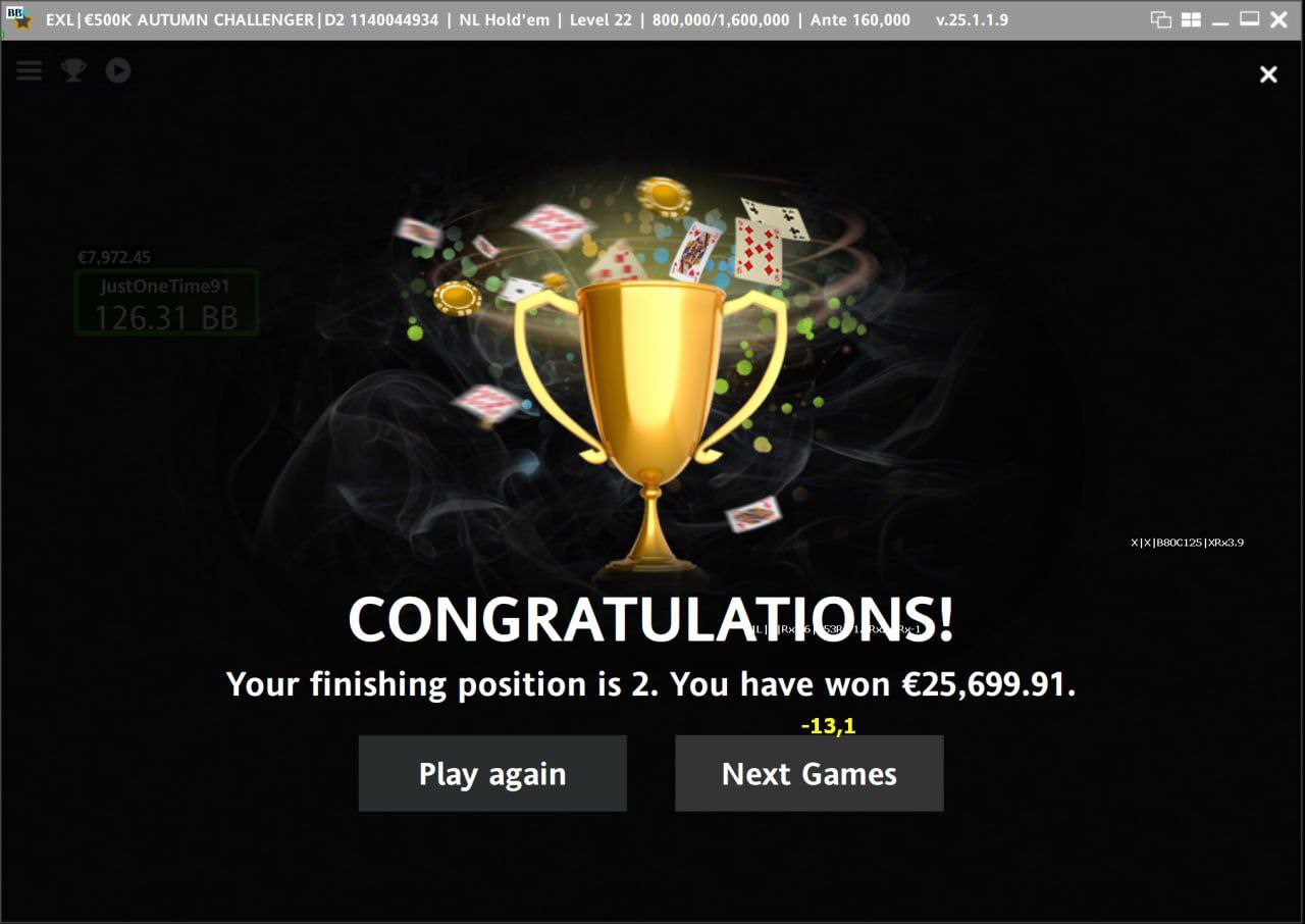 16.11.2023 наш игрок с ником ANTISEPTIC выиграл €8,000 в Twister SNG на лимите €10