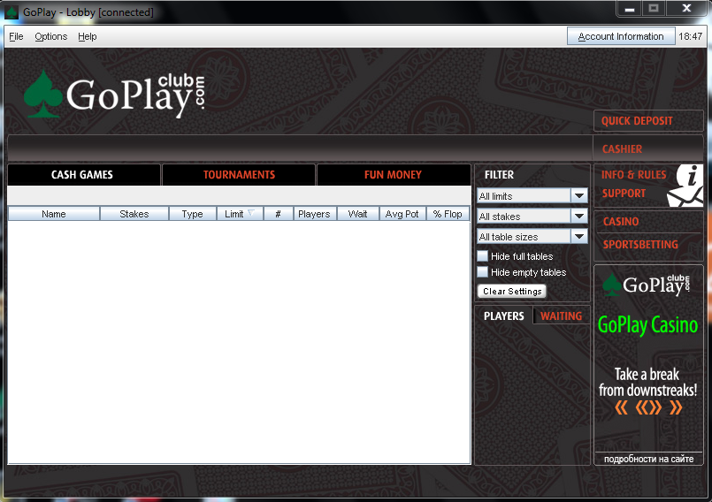 Достоинством интерфейса игровой программы является предельный лаконизм формы: отсутствие дисгармоничных аватар и громоздкой имитации интерьера реального клуба. Аскетичный дизайн создает благоприятную атмосферу для спокойной сосредоточенной игры в спортивный покер. Программа проста в использовании и в то же время регулярно радует игроков новыми функциями: легкий и быстрый выбор точного размера ставки, просмотр сброшенных в пас карт, чат с партнерами по столу и пр. Оперативно и четко работает круглосуточная русская и англоязычная служба поддержки клиентов. В ассортименте игр присутствуют все классические виды покера с широким диапазоном ставок; имеется богатый выбор турниров: для любого банкролла, включая нулевой. Любые ваши вопросы адресуйте: affiliate@perpetuumpoker.com