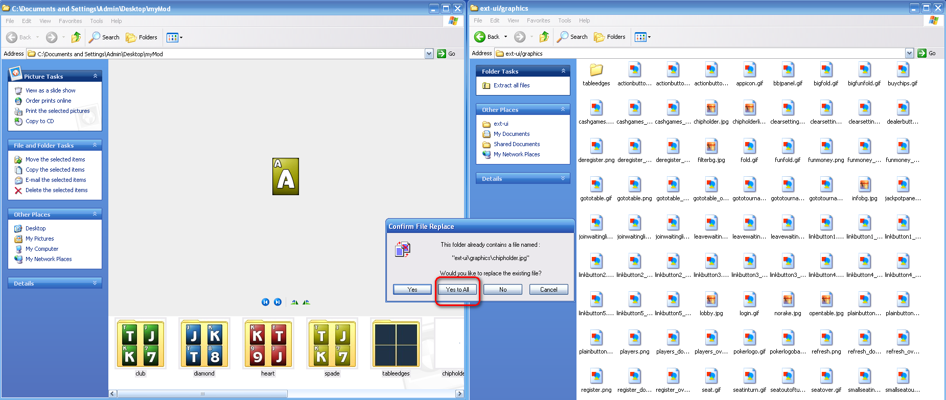 С приходом своим в сеть Entraction (B2B) и поняв, что мне здесь нравится, я задался вопросом, а как сделать так, что бы игра здесь была еще приятнее. Или, проще говоря, какой мод поставить, что бы удобнее было играть. На вопрос в соответствующей ветке форума я не получил ни единого ответа. Пришлось рыться самому. Результатами своего "расследования" с радостью делюсь: Первое, что придется сделать - это скачать какой-нибудь мод. Я скачивал много и отовсюду. Потом перекраивал с учетом своих требований ( а основное из моих требований - минимум графики и украшений. Глаз не должен уставать при мультитэйблинге и остается место для статов). Вот такой мод я сообразил: Не буду упоминать авторов всех фрагментов (их деяния в свободном доступе в интернете), разве что не забуду поблагодарить Aprisobal за Chip Count Изображенный комплект модов можно скачать тут Если вы захотите изменить какую-либо часть, меняйте сами (или скачивайте готовое) и вставляйте потом по той же самой инструкции. Для начала, что мы будем менять: непосредственно сам стол (table.jpg) место игрока, чей ход в данный момент (seatinturn.gif) места остальных игроков, (seatoutofturn.gif.gif) рубашка карт (fold.gif) изображение баттона (dealerbutton.gif) чипсы у дилера - или куда надо кликнуть что-бы пополнить стек (поскольку я использую АвтоРебай, я вообще убрал это изображение, для чего использовал chipholder.jpg) папки club, diamond, heart и spade хранят изображения карт папка tableedges хранит углы столов. Если вы меняете изображения стола на любое, отличное от оригинала, используйте содержимое этой папки из приведенного выше источника! для отображения размеров ставок нужно заменить pokerclient.jar, посдедняя версия которого всегда есть тут, а последняя на момент написания данного поста включена в основной архив Итак, КАК это все применить у себя на компе (извините, что написано чрезмерно подробно, но лучше так, чем те описания, которые мне удалось найти): 0. Закройте покер-клиент (покер-программу) 1. Создайте у себя на компе папку, куда сохраните те файлы которые считаете нужным заменить. Если вам нравится тот стиль который изображен выше - качайте тут ШАГ 1 ничего не меняя ( Если хотите что-то изменить - меняйте соответствующий файл в архиве ). Разархивируйте файлы в этой же папке. ШАГ 2 Потом перейдите в папку с установленным клиентом (для Windows XP по умолчанию это C:\Program Files\B2BPOKER\NoiQpoker) и зайдя в опции папки включите отображение расширений для известных типов файлов (уберите голочку из чек-бокса, указанного на картинке): ШАГ 3 Потом зайдя в папку, с установленным клиентом (в моем примере это Noiq poker), переименуйте файл ext-resources.jar в ext-resources.jar.zip (клик правой кнопкой мыши и выбор Rename (Переименовать) ШАГ 4 Появится окно, предупреждающее, что Вы собираетесь переименовать расширение файла. Соглашайтесь ШАГ 5 Теперь этот файл выглядит как папка. В которую и заходим. ШАГ 6 Потом заходим в ext-ui ... ШАГ 7 и в ней в graphics ШАГ 8 Теперь копируем все, кроме pokerclient.jar из приготовленной нами папки с МОДом в папку graphics. ШАГ 9 В появившемся окне с предупреждением о совпадении и замене файлов кликаем Ок ШАГ 10 Теперь возвращаемся обратно на 3 уровня выше (в корневую папку клиента) и совершаем обратное переименование из ext-resources.jar.zip в ext-resources.jar: И последнее, в главную папку клиента копируем файл pokerclient.jar (единственный не использованный нами до сих пор). Я бы рекомендовал все же последнюю версия этого файла брать отсю