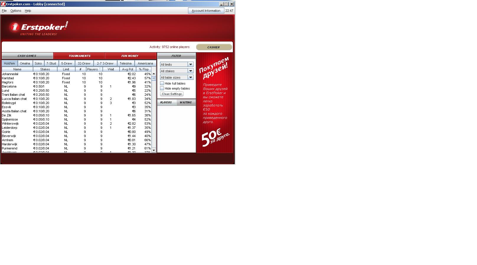 С Уважением, Виталина Сегодня на сайте появились условия вступления в Erstpoker Team: Любой пользователь зарегистрированный на сайте Erstpoker.com может присоединиться к нашей команде. Члены Erstpoker Team показавшие высокие результаты в оф-лайн(он-лайн) турнирах будут приглашены в Erstpoker Team Pro и получат годовые спонсорские контракты. Преимущества Erstpoker Team : • Поддержка 24\7\365 персонального менеджера • Оперативное решение Ваших вопросов • Ежемесячная ЗП • Выплата РБ по Вашему требованию в течении 1-24 часов • Бронирование отелей по всему миру • Визовая поддержка при выезде на любые турниры Два основных критерия отбора в Эрстпокер Тим: 1. Вы не должны иметь аккаунтов в сети Энтракшен. 2. Вы должны набирать не менее 10 000 VIP очков в месяц, Ваша ЗП будет составлять 3500 евро ежемесячно. Хочу обратить Ваше внимание, что зарплата не является скрытой формой РБ, если Вы будете набирать 20 000 очков, ЗП не изменится. 3. Каждый претендент рассматривается индивидуально. Все вопросы связанные с вступлением в команду Вы можете задать по адресу support@erstpoker.com или по Skype: erstpoker http://erstpoker.com/ru/Erstpoker-Team-Pro.aspx