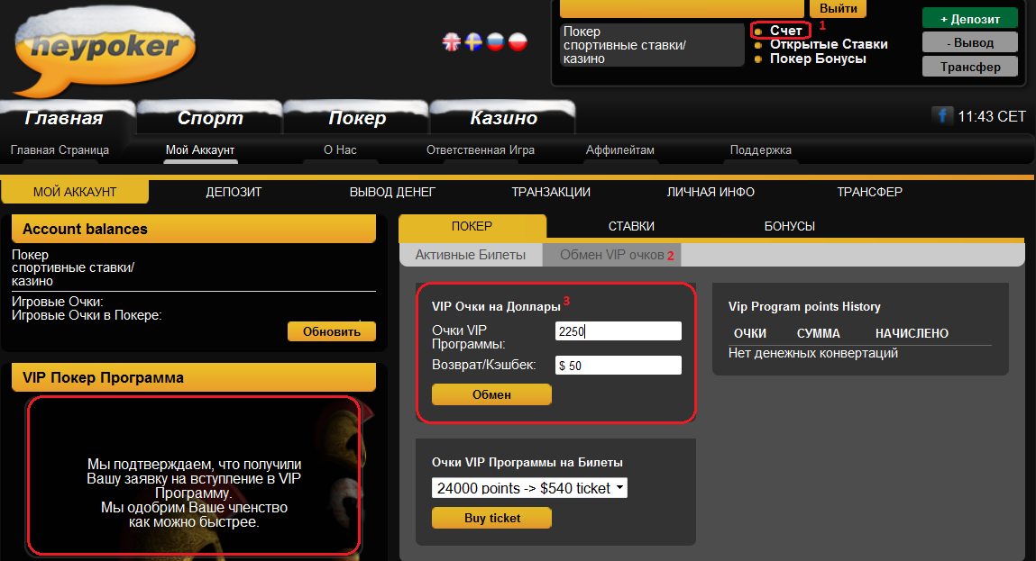 В этой ветке форумчане Vigorish могут задавать общие вопросы по поводу HeyPoker, получать информацию о предстоящих акциях, читать новости комнаты. Ввиду политики защиты данных игроков, некоторые конкретные вопросы я заранее прошу отправлять нам на email адрес. ФИШКА ЭТОГО МЕСЯЦА Несколько причин играть в HeyPoker в ноябре 2011: - Специальная гонка на $2000 только для русских игроков - Фрироллы на сумму $4.000 ежемесячно - Программа лояльности до 40% кэшбэк - обменивайте очки хоть ежедневно - Бонусы на первый депозит до $2000 (возможно отыгрывать бонус вместе с активной программой лояльности) Бонус на первый депозит до $2000 + одновременно с ним VIP программа до 40% кэшбэк[/size] _______________________________________________________________________________________________________________________________________ Специальная гонка только для русских игроков на $2000 В ноябре мы предлагаем вам участвовать сразу в двух эксклюзивных покер гонках. Общий призовой фонд составляет $2000 и 20 финалистов получат денежное вознаграждение за участие. Уникальность акции в том, что эти гонки проводятся только на HeyPoker, только для пользователей из России, и только для игроков, которые зарегистрировались в октябре и ноябре. Участников будет мало и победа в гонке станет приятным дополнением к другим вознаграждениям комнаты. Два этапа гонки: - $1000 гонка с 1 ноября по 15 ноября - $1000 гонка с 16 ноября по 30 ноября Более подробную информацию смотрите в разделе промо-акции на официальном сайте комнаты _______________________________________________________________________________________________________________________________________ ТЕКУЩИЕ АКЦИИ $250 БЕСПЛАТНО ДЛЯ ВСЕХ Дата проведения: 4-oe , 11-ое Декабря Призовой фонд : $250 Вы никогда не играли в покер и боитесь сделать свой первый депозит. У вас есть хорошая возможность выиграть реальные деньги и попробовать онлайн покер совершенно бесплатно и без риска. Каждое первое и второе воскресенье месяця в 20:00 CET мы проводим бесплатный турнир только для игроков HeyPoker. Призовой фонд составляет $250, а играть может каждый без каких-либо условий! Требование для участия: никаких Фриролл $2000 BANKROLL BOOSTER Дата проведения: 6 Декабря Призовой фонд : $2000 У вас есть шанс совершенно бесплатно увеличить свой банкролл, только когда вы регистрируетесь на HeyPoker. С этого момента это будет турнир для всех депозиторов! Если раньше, в BankrollBooster могли принимать участие только игроки, которые только недавно подключились к HeyPoker, то теперь всё что вам нужно сделать, чтобы снова получить специальный билет – это внести любую сумму денег на личный покерный счёт (проще говоря сделать депозит). Требование для участия: сделать любой депозит в комнату Специальный турнир Hey $1000 Диамант Дата проведения: 25 декабря Призовой фонд : $1000 Все игроки, которые набрали 200 игровых очков или больше, могут участвовать и побороться за призовой фонд в 1,000 долларов. Как квалифицироваться: Наберите 200 игровых очков с 1-ое по 20-ое число месяца. Как только вы наберете 200 очков, вы получите специальный билет на данный турнир. Специальный турнир Hey $500 Золото Дата проведения: 18-ое Декабря Призовой фонд: $500 Все игроки, которые набрали 100 игровых очков за календарный месяц будут вознаграждены билетом на турнир с призовым фондом $500. Турнир проводится в 3-ее воскресенье каждого месяца, а попасть на него можно очень просто, играя всего несколько минут в онлайн покер за месяц. Как квалифицироваться: Наберите 100 игровых очков с 1-ое по 14-ое число каждого меся