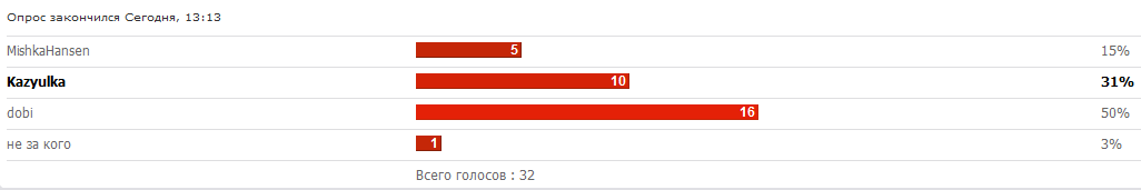 В Финал конкурса, по итогам предварительного голосования выходят;MishkaHansen, Kazyulka и dobi!