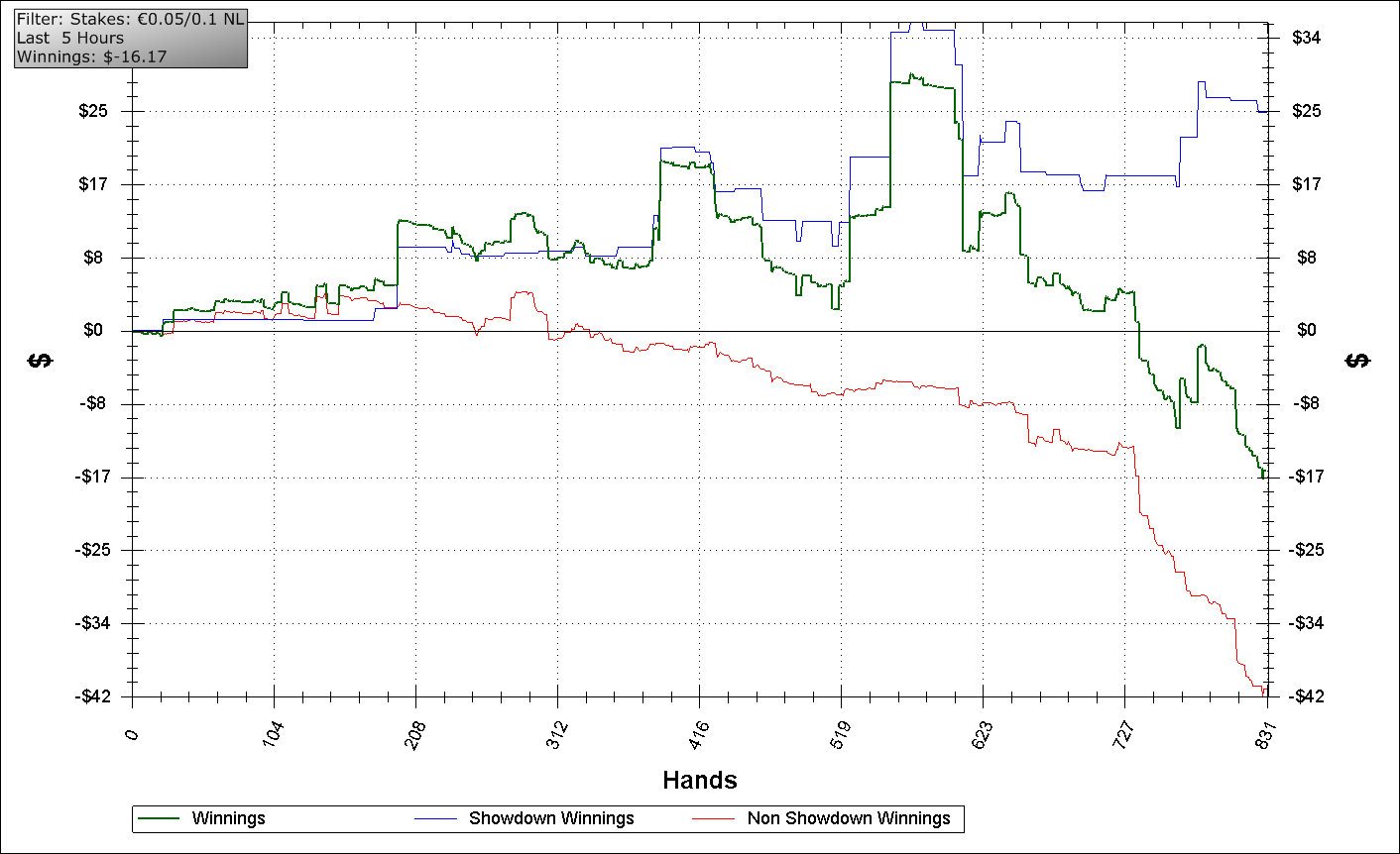 CO ($14.20) BTN ($4.10) Dealt to Hero T  T Hero raises to $0.35, UTG+1 calls $0.35, fold, fold, fold, fold FLOP ($0.85) 2  7  9 Hero bets $0.70, UTG+1 raises to $3.69 (AI), Hero calls $2.99TURN ($8.23) 2  7  9  A RIVER ($8.23) 2  7  9  A  4 Hero shows T  T (Pre 56%, Flop 73.6%, Turn 4.5%) UTG+1 shows J  A (Pre 44%, Flop 26.4%, Turn 95.5%) UTG+1 wins $7.83 Пока его не было я шел в +3БИ. А как только он за первый стол подсел, так результат не заставил себя долго ждать