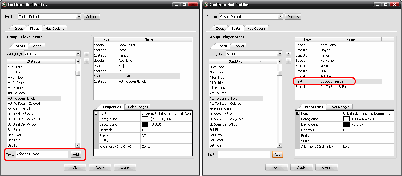 После выбора категории статов (при заходе на вкладку "Stats" категория "All Stats" выбрана по умолчанию) в поле "Statistics" отображаются все статы входящие в выбранную нами категорию статов. Для добавления нового стата в нашу группу статов, первым делом в поле нашей группы статов выделяем стат после которого мы хотим добавить новый стат, затем в поле "Statistics" дважды щелкаем левой кнопкой мыши на стате который мы хотим добавить. Новый стат добавляется в поле группы статов к уже имеющимся статам. Также мы можем добавлять в нашу группу статов и текстовую информацию (вспомогательная информация). Для этого в поле "Text" набираем необходимую текстовую информацию и нажимаем кнопку "Add". Примечание: При необходимости Вы можете добавлять и “пустой” текст, для этого просто нажмите кнопку "Add", ничего не вводя в поле "Text". Это может понадобиться, если мы располагаем статы в столбцах и нам необходимо, чтобы в одном из столбцов ничего не отображалось. Для того чтобы стат или информация отображалась с новой строки необходимо добавить перед ними разделитель. Разделители находятся на вкладке "Special" и добавляются так же двойным щелком мышки. Разделители представлены в виде "New Line" и "Horizontal Line". "New Line" просто позволяет начать вводить статы с новой строки, "Horizontal Line" в дополнение к этому добавляет визуальную горизонтальную линию. На вкладке "Special" находится еще один важный элемент Hud "Note Editor" с помощью этого элемента можно делать и просматривать заметки на игроков прямо за игровым столом. Добавляется также как и остальные элементы, двойным щелчком мышки. С помощью кнопок "▼" "▲" можно перемещать статы и разделители вверх или вниз в списке поля группы статов. Удаляется не нужная информация (стат, разделитель, текст) из списка поля группы статов, двойным щелчком мышки по ней. На вкладке "Properties" мы можем настроить вид отображения стата, текстовой информации на игровом столе. Для этого выделяем стат или текстовую информацию и смотрим их параметры на вкладке "Properties", и при необходимости изменяем их. В поле "Font" мы видим, каким шрифтом отображается наш стат или текстовая информация (в дальнейшем - текст) на игровом столе. Нажав кнопку "…" можно изменить шрифт отображения. В появившемся окне выбираем необходимые нам параметры шрифта и нажимаем кнопку "ОК". Примечание: Также Вы можете изменить параметры шрифта и другим способом, нажав значок "+", развернутся параметры шрифта, и Вы сможете их изменить. В поле "Foreground", нажав кнопку "…" можно изменить цвет шрифта. Покажется окно выбора цветов, выбираем необходимый нам цвет и нажимаем кнопку "ОК". В поле "Background", нажав кнопку "…" можно изменить цвет фона шрифта. Покажется окно выбора цветов, выбираем необходимый нам цвет и нажимаем кнопку "ОК". Продолжение → |