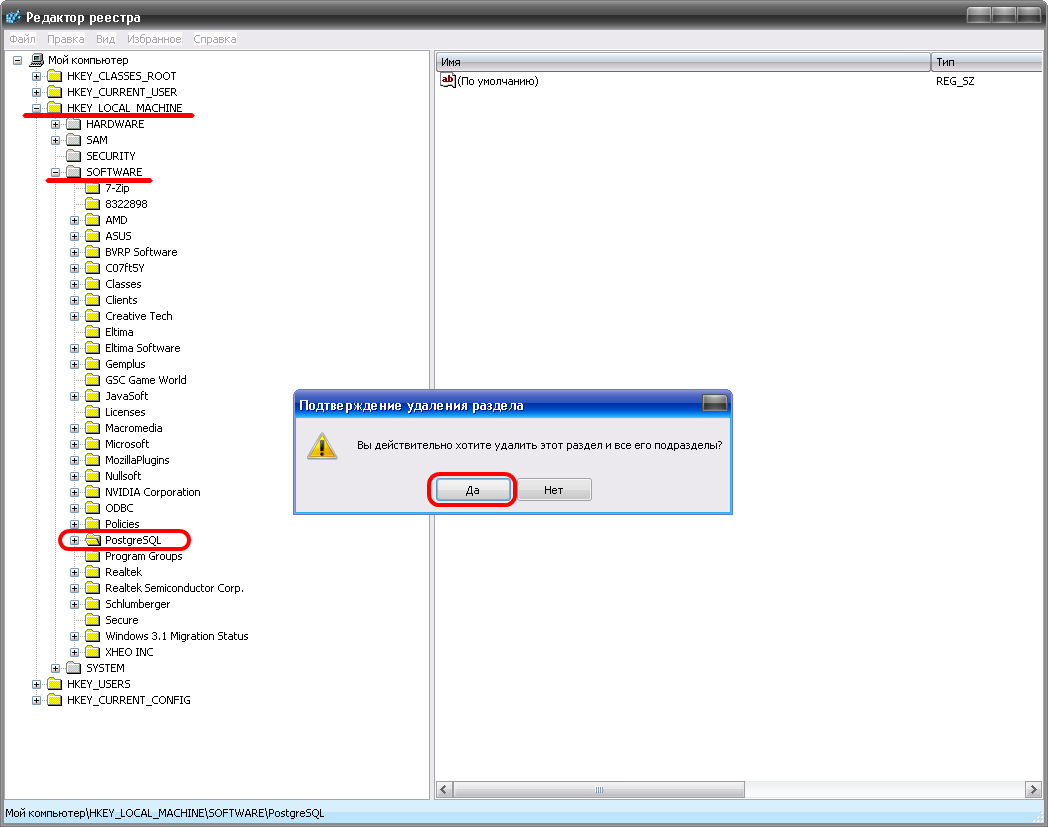 "HKEY LOCAL MACHINE\SOFTWARE\PostgreSQL" и удаляем ее.