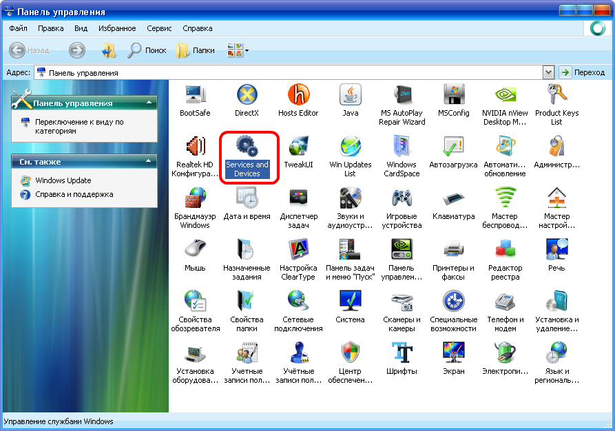 "Services and Devices" и дважды кликаем мышкой по ней.