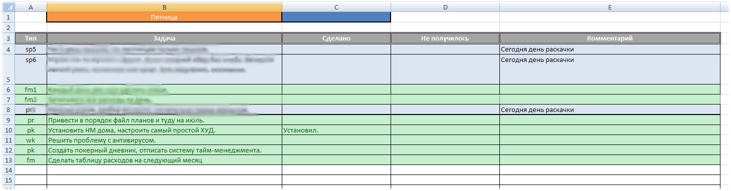 Еще в закладке за каждый день есть отдел для дневника, в котором я описывают телеграфным стилем события за день, которые не попали в список задач. Это помогает вместе со списком задач достаточно точно определить, чем был заполнен этот день.