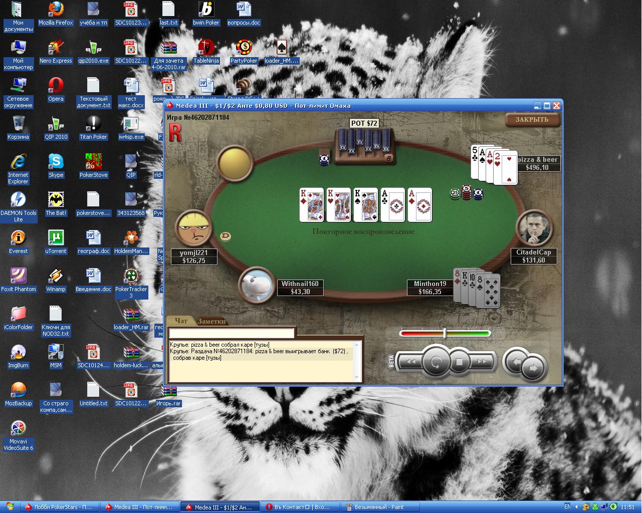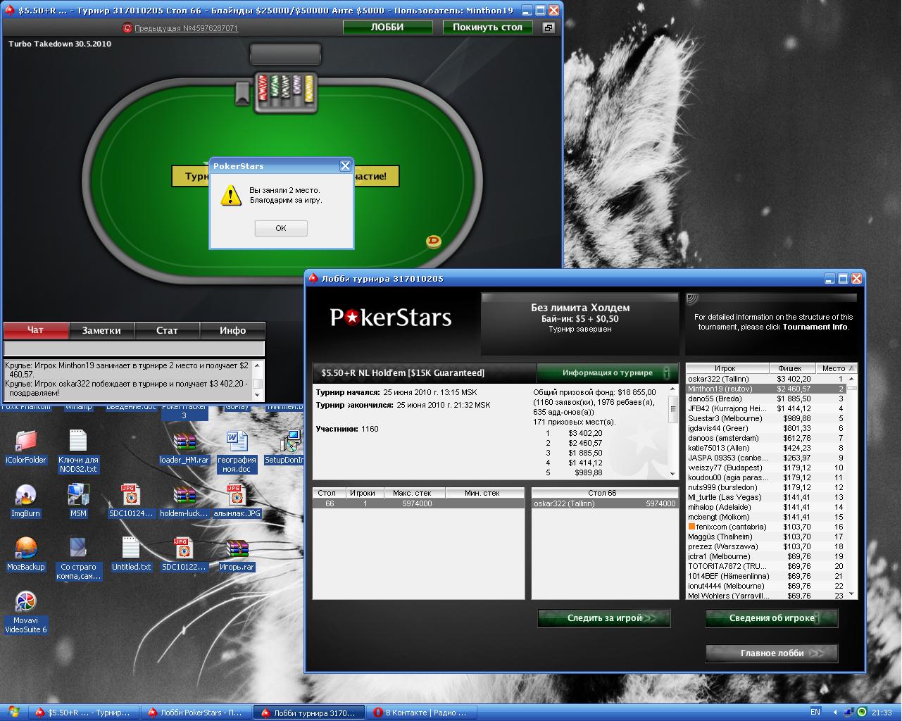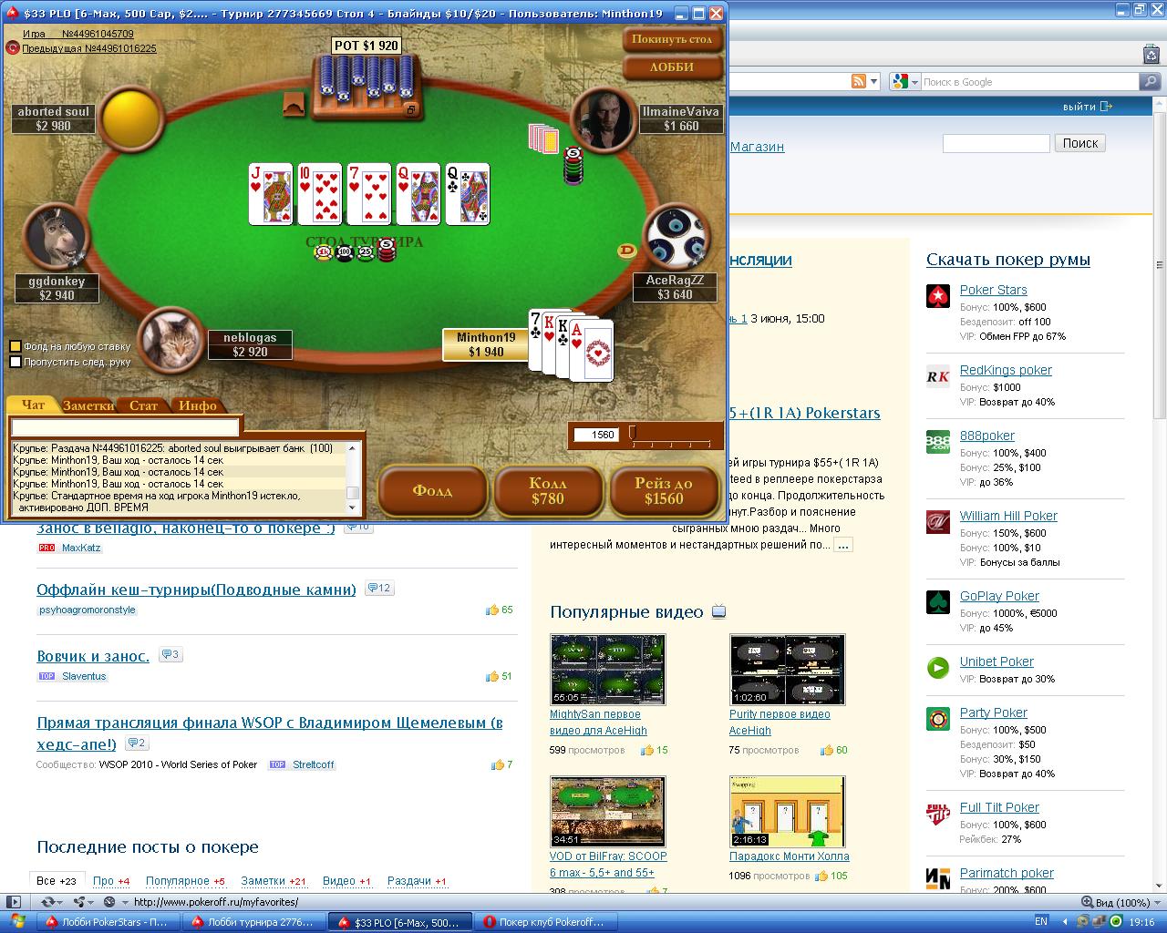 На моих ненаглядных старзах снова дурацкая профилактика,игры нет,а значит я просто уже невправе перед собой откладывать создание этого колодца!) Кстати,в описании того,что же такое "колодец" прям очень пугающая формулировка,я уж было подумал,а не много ли я на себя беру,но дневник я както просто не смогу наверно достаточно наполнить интересной информацией,а колодец всё же както полегче,надеюсь будем поддерживать его на плаву вмесет.Надеюсь моей квалификации хватит=) История восхождения проста как мир,если будет желание-я вам расскажу в красках)А так,через несколько месяцев не очень понятной игры я наткнулся на доны,пересмотрел ВОДы по ним(ОГРОМНОЕ спасибо небезызвестному gnat777,какие бы не были воды,они просто дали толчок,и убедили меня в мысли - "Я МОГУ")и начал катать в месяце эдак наверно в июне,июле.Не мне судить конечно,но вроде получается добрался до 50ок,впринципе даже после ежемесячно кешаута вполне по банкроллу валить на 100ки,чем наверно в скором времени и займусь.Наверно немного сумбурно получилось и не так чтоб очень конструктивно,но у нас всё впереди и я обязательно расскажу всё более подробно=) успехов нам всем,спрашивайте и услишите=) P.S. совсем забыл о самом главном,статистика,кудаж без неё,как раз получилось приятное сочетание букавок даблв=)если у кого есть возможность предоставить мне шаркскоповскую "лесенку"-буду благодарен) Никнейм Всего игр Ср. профит Ср. бай-ин Ср. ROI Профит Данные Комната minthon19 9356 +$3.45 $62 7% +$32293 LWWLWWLL PokerStars UPD: появился мой вод=) найти можно тут http://rapidshare.com/files/331741815/V ... thon19.swf или /section71/torrent5220.html Вод номер два - http://rapidshare.com/files/339463763/2 ... 9.swf.html или /section71/torrent5338.html А теперь 10ки =) http://rapidshare.com/files/355622605/V ... 19.swf.htm или /section71/torrent5703.html Скайп minthon19 Последний раз редактировалось Minthon 01 фев 2011, 21:58, всего редактировалось 16 раз(а).