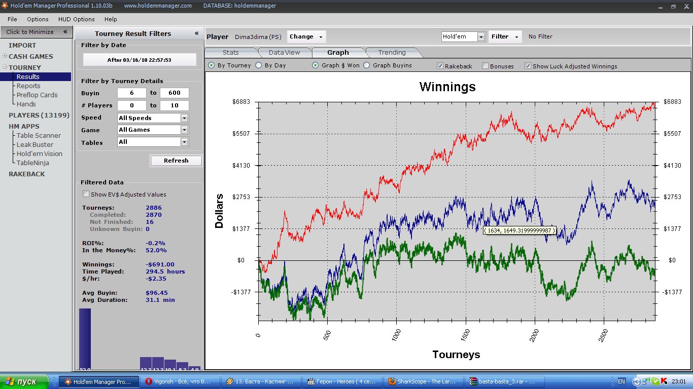 На моих ненаглядных старзах снова дурацкая профилактика,игры нет,а значит я просто уже невправе перед собой откладывать создание этого колодца!) Кстати,в описании того,что же такое "колодец" прям очень пугающая формулировка,я уж было подумал,а не много ли я на себя беру,но дневник я както просто не смогу наверно достаточно наполнить интересной информацией,а колодец всё же както полегче,надеюсь будем поддерживать его на плаву вмесет.Надеюсь моей квалификации хватит=) История восхождения проста как мир,если будет желание-я вам расскажу в красках)А так,через несколько месяцев не очень понятной игры я наткнулся на доны,пересмотрел ВОДы по ним(ОГРОМНОЕ спасибо небезызвестному gnat777,какие бы не были воды,они просто дали толчок,и убедили меня в мысли - "Я МОГУ")и начал катать в месяце эдак наверно в июне,июле.Не мне судить конечно,но вроде получается добрался до 50ок,впринципе даже после ежемесячно кешаута вполне по банкроллу валить на 100ки,чем наверно в скором времени и займусь.Наверно немного сумбурно получилось и не так чтоб очень конструктивно,но у нас всё впереди и я обязательно расскажу всё более подробно=) успехов нам всем,спрашивайте и услишите=) P.S. совсем забыл о самом главном,статистика,кудаж без неё,как раз получилось приятное сочетание букавок даблв=)если у кого есть возможность предоставить мне шаркскоповскую "лесенку"-буду благодарен) Никнейм Всего игр Ср. профит Ср. бай-ин Ср. ROI Профит Данные Комната minthon19 9356 +$3.45 $62 7% +$32293 LWWLWWLL PokerStars UPD: появился мой вод=) найти можно тут http://rapidshare.com/files/331741815/V ... thon19.swf или /section71/torrent5220.html Вод номер два - http://rapidshare.com/files/339463763/2 ... 9.swf.html или /section71/torrent5338.html А теперь 10ки =) http://rapidshare.com/files/355622605/V ... 19.swf.htm или /section71/torrent5703.html Скайп minthon19 Последний раз редактировалось Minthon 01 фев 2011, 21:58, всего редактировалось 16 раз(а).