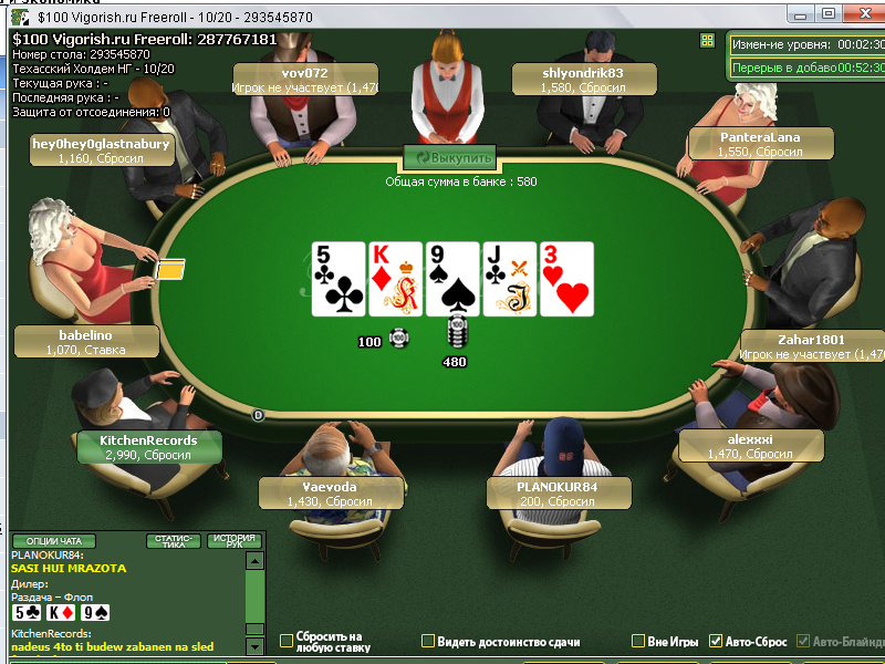 Уровни повышаются каждые 10 мин. Ребай: $1, стек - 1500 (бесконечные) Аддон: $1, стек - 3000 Начальный стек - 1500. Кто может принять участие? Турнир доступен для всех игроков, достаточно ввести пароль, который указан ниже по тексту. Если вы хотите играть в Пари Матч покер вместе с Vigorish.ru, тогда вам необходимо при регистрации указать код приглашения ресурса "VIGORISH", ссылка перехода к регистрации: перейти к регистрации в Пари Матч покер c кодом приглашения Полное описание предложения для игроков от Vigorish.ru можно почитать здесь -> section58/topic2166.html Как принять участие? Во вкладке "Scheduled" / "Specials" найдите фриролл с названием "$100 Vigorish.ru Freeroll"... Турнир обычно создается за 2-3 дня до начала! Пароль: Секрет: только для игроков «Parimatch» Вам необходимо добавить покерную комнату «Parimatch» в персональный список.1. Необходимо зарегистрироваться на этом ресурсе и авторизироваться. 2. Перейти в персональный список покерных комнат (ссылка выше, в блоке скрытого текста). 3. Ввести никнейм в комнате, выбрать комнату и добавить ее. 4. Зайти обратно на эту страницу с описанием турнира - вы увидите скрытый текст. Ссылка на клиентскую программу рума Если ваш антивирус не дает скачать программу с сайта рума, можете ее скачать с Вигориш: download/poker/parimatch/SetupPoker.exe Оффлайн турниры проводимые при поддержке рума Пари Матч покер является генеральным спонсором турнира RED SEA POKER CUP’09. 24-31 мая / May 24-31 -> http://www.vigorish.ru/section57/topic2803.html ![]() Пари Матч покер проводит сателлиты турнира KIEV POKER OPEN 2009. 21-24 мая / May 21-24 -> http://www.vigorish.ru/section57/topic2503.html Расписание турниров здесь -> http://www.alabama.in.ua/tournaments/schedule/kiev-poker-open-2009-main-event-satellites/ |