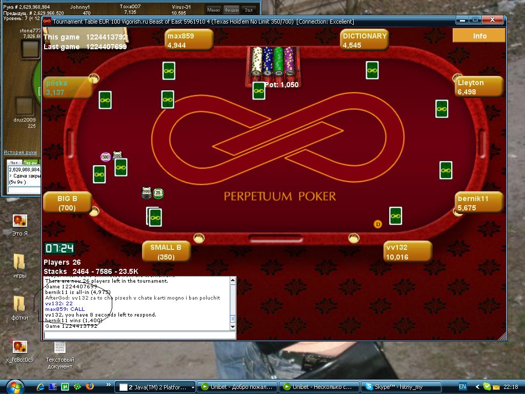 Дисциплина: Безлимитный Техасский Холдем Место проведения: покерная комната Perpetuum Poker http://www.perpetuumpoker.com (переход к регистрации) Время проведения: 28 мая 2009 (Четверг) - московское время 21:00 Бай-ин: фриролл Призовой фонд: €100 Уровни повышаются каждые 10 мин. Ребай: €1, стек - 1500 (бесконечные) Аддон: €1, стек - 3000 Начальный стек - 1500. Кто может принять участие? Турнир доступен для всех игроков, достаточно ввести пароль, который указан ниже по тексту. Если вы хотите играть в Perpetuum Poker вместе с Vigorish, тогда вам необходимо при регистрации указать код приглашения ресурса "vigorishpp", ссылка перехода к регистрации: перейти к регистрации в Perpetuum Poker Полное описание предложения от Perpetuum Poker для игроков Vigorish можно почитать здесь -> section58/topic2431.html Как принять участие? В турнирах во вкладке "Special" найдите турнир с названием "€100 Vigorish.ru Beast of East"... Турнир обычно создается за 2-3 дня до начала! Пароль на турнир: kjhg Внимание! Тем, кто хочет "по дружбе" передать пароль третьим лицам: им нужно обязательно зарегистрироваться у нас и добавить свой никнейм в персональный список покерных комнат, иначе, если будет занято призовое место, то им может не быть выплачен выигрыш - он перейдет к другому участнику. |