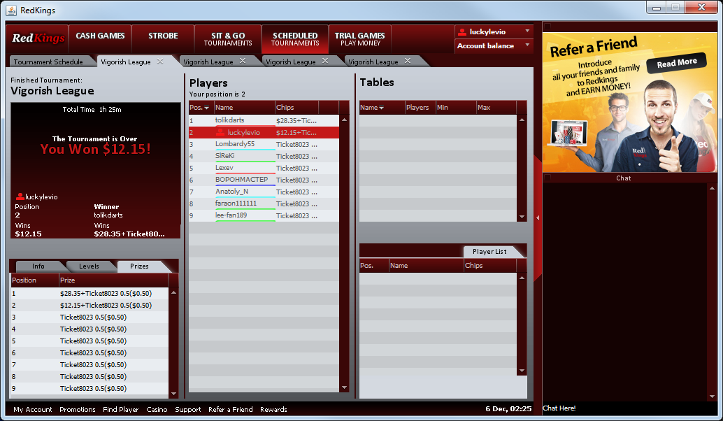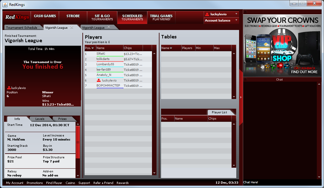 Это собственная, приватная лига турниров, с накопительным призовым фондом! Vigorish League Добавленный призовой фонд увеличен в 4 раза и составляет 400$! Уже интересно? Тогда читаем дальше! Условия участия: 1. В серии могут принимать участие все игроки форума, в том числе и те кто зарегистрирован под другими афф программами, но все же крайне рекомендуется участие, тем у кого нет аккаунта, зарегистрировать его через нас по этой ссылке: RedKings Вы получите доступ к всем нашим акциям, и например получите доступ к нашей рейк-гонке, в которой можно выигрывать денежные призы, а во время нашей лиги, выиграть билеты на участие в турнирах: гонка Если у Вас есть аккаунт в RedKings, но Вы давно не играли на деньги, или вообще не делали депозит, то пишите мне в ЛС или на support@vigorish.ru и мы попробуем переписать Вас под нашу программу. *** 2. Чтоб любой турнир серии был признан состоявшимся нужно минимум 4 человека. *** 3. Все игроки обязаны соблюдать правила RedKings во время игры, за попытки мошенничества и командной игры возможно санкции. *** 4. Всем участникам начисляются рейтинговые очки. За участие и за попадание в деньги. По такой системе: Баин 2$ разыгрывается 7 очков, среди тех кто попал в призы пропорционально распределению призового фонда. Всем участникам по 0,7 очка за участие. Баин 3$ разыгрывается 10,5 очков +за участие всем по 1,05 Баин 5$ разыгрывается 17,6 очков +за участие всем по 1,75 Баин 10$ разыгрывается 35,3 очков +за участие всем по 3,5 *** 5. ТОП-5 лучших по рейтингу, по итогам серии 1.12.2014 - 21.12.2014 Получают призы из накопительного призового фонда. Распределение призовых в лидерборде (100% накопительного фонда): 1-место 40%, 2-место 26%, 3-место 16%, 4-место 10% 5-место-8% * В случае дележа очков, вводятся следующие дополнительные показатели: 1) Количество побед в серии турниров 2) Количество призовых выигранных в ходе серии 3) Если и эти показатели равны бросается жребий, с помощью сайта random.org *** 6. Турниры будут появляться в руме в разделе special, найти их будет легко по названиям серии "Vigorish League", вход по паролю: vigorish *** 7. Отчисление из призового фонда в накопительный джекпот 10% от призового фонда, отчисление будет идти по схеме "фиктивных турнирных билетов" у вас будут время от времени появляться билеты, на которые никуда нельзя зарегистрироваться, этим способом рум отчисляет необходимые средства в джекпот. Расписание турниров серии, 1.12.2014-21.12.2014 Примечания: С каждого турнира отчисляется 10% в накопительный призовой фонд лидерборда, который будет распределён среди игроков из ТОП-5 по итогам серии. Ваши предложения по серии турниров: тут Призы. Добавленный призовой фонд 400$ идёт сюда: Накопительный призовой фонд, который будет постоянно расти, стартовая сумма: 200$ +4 дополнительных приза за лучшие результаты показанные в турнирах за 2,3,5,10$. Берутся лучшие результаты по кол-ву набранных очков в каждой номинации. Король турниров по 11 долларов, приз: 85$ Король турниров по 5,5 долларов, приз: 55$ Король турниров по 3.3 доллара, приз: 35$ Король турниров по 2,2 доллара, приз: 25$ Итоги: Короли турниров: Короли турниров: Король 2$ - Anatoly_N 35.7 Король 3$ - ВОРОНМАСТЕР 60,9 Король 5$ - ВОРОНМАСТЕР 156.43 Король 10$ - Lombardy55 228.82 Итоговый лидерборд серии Vigorish League: 1. ВОРОНМАСТЕР 468,08 2. Lombardy55 368,07 3. luckylevio 358,97 4. Anatoly_N 349,64 5. tolikdarts 332,77 6. powersellero 199,25 7. Lexev 150,22 8. lee-fan189 131,69 9. SireKi 59,53 10. faraon111111 25,9 11. WolfgangCM 6.3 12. Redwap 4,9 13. Mihail1688 4.2 14. kramplayer 1.75 15. SweetCandy_ 1.05 16. vigorish2014 0.7 Накопитель