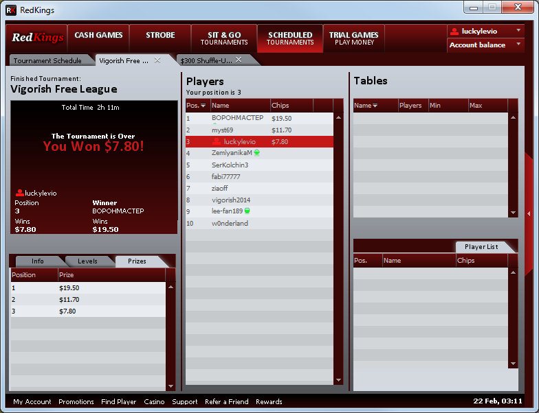 Это собственная, приватная лига турниров, c бесплатным входом в многие турниры и минимальными баинами, для новичков сайта и любителей покера! Vigorish Free League 05.04.2015 - 03.05.2015 Добавленный призовой фонд 355$! ************************** Условия участия, дополнительные призовые, начисление рейтингов и другие важные подробности: 1. В серии могут принимать участие все игроки форума, в том числе и те кто зарегистрирован под другими афф программами. А новички форума и те у кого нет аккаунта, должны зарегистрировать его через нас по этой ссылке: RedKings Это люди которые зарегистрированы на форуме менее 3х месяцев назад. Т.е. не новичок форума, это человек который находится на форуме более 3х месяцев, если считать от первого дня Лиги. Вы получите доступ к всем нашим акциям, и например получите доступ к нашим рейк-гонкам, в которых легко попасть в призы. Если у Вас есть аккаунт в RedKings, но Вы давно не играли на деньги, или вообще не делали депозит, то пишите мне в ЛС или на support@vigorish.ru и мы попробуем переписать Вас под нашу программу. Также в случае проблем с депозитом, производим обмен денег RK на Ваши средства популярных платежных систем. Обращайтесь. 2. Чтоб любой турнир серии был признан состоявшимся нужно минимум 5 человек. *** 3. Все игроки обязаны соблюдать правила RedKings во время игры, за попытки мошенничества и командной игры возможно санкции. *** 4. Всем участникам начисляются рейтинговые очки. За участие и за попадание в деньги. По такой системе: По такой системе, на каждый турнир дается 10 очков, они разыгрываются, в соответствии с распределением призового фонда, плюс дополнительно каждый участник получают по 1 очку за участие. В турнирах с баином 1.20$ разыгрывается 15 очков, в соответствии с распределением призового фонда, плюс дополнительно каждый участник получают по 1,5 очка за участие. *** 5. Пятерка лучших, по итогам серии 05.04.2015 - 03.05.2015 получит призы, в соответствии с занятыми местами по итогам серии: 1 место 50$ 2 место 25$ 3 место 15$ 4 место 10$ 5 место 5$ Для получения призов призёр должны наиграть за 1 место - 100 очков RK, 2 место 50 очков RK, 3 место - 20 очков RK, 4 место -10 очков RK, 5 место - 5 очков RK. В случае дележа очков, по итогам серии, вводятся следующие дополнительные показатели: 1) Количество побед в серии турниров 2) Количество призовых выигранных в ходе серии 3) Если и эти показатели равны бросается жребий, с помощью сайта random.org *** 6. Турниры будут появляться в руме в разделе special, найти их будет легко по названиям серии "Vigorish Free League", вход по паролям, к каждому турниру новый пароль. Будет выслан методом личных сообщений. *** 7. Для участия в любом турнире и соответственно получения пароля, нужно сделать заявку в этой теме на участие в ближайших турнирах. Пароль будет выслан за 60..20 минут до старта. Расписание турниров серии 05.04.2015 - 03.05.2015, начало всех турниров в 21-00 мск Итоговый рейтинг 1. BOPOHMACTEP 45.5 2. spartakole77 37.5 3. DonKaprano 25 4. best60 23.5 (по количеству побед в турнирах) 5. myst69 23.5 (по количеству побед в турнирах) 6. Katamaran84 22.5 7. mariolKK 14.5 8. kramplayer 13 9. Redwap 12.5 10. ziaoff 12 11. ZemlyanikaM 11,5 12. Mario99 10.5 13-14. Myteam77 9 13-14. BelRussland 9 15-16. JustSmileMan 7,5 15-16. vigorish2014 7.5 17-18. powersellero 6,5 17-18. luckylevio 6,5 19-20. alexbeloz777 6 19-20. Anatoly_N 6 21-22. s1imxl 5 21-22. -BRV80- 5 23. trabika007 4,5 24-28. fabi77777 4 24-28. 09Borusse 4 24-28. AkiVigo 4 24-28. dimets1985 4 24-28. soarer2111 4 29. FishKa65 3,5 30. Fat Old Stan 3 31. Lombardy55 2,5 32. SIReKi 2 33-35. 1964taxi64ru 1,5 33-35. labocca4 1.5 33-35. 3tonBabai 1,5 36-41. tyty 1 36-41. olegamed 1 36-41. madevgeni72 1 36-41. chehanton 1 36-41. ahuzoho_VE 1 36-41. Dmitry77 1 Напоминаю, для получения пароля на 