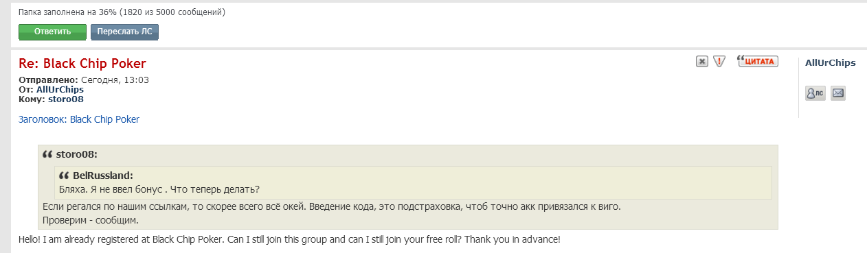 Дата проведение фриролла: 17 января в 21-00 msk. Турнир доступен в лобби Black Chip Poker, название турнира: Vigorish Invitational Freeroll Найти турнир в лобби легко, tourney - private - all : Призовой фонд: 150$ Условия участия: регистрация через нас под кодом: vigo2 Обзор комнаты и инструкции по регистрации в ветке рума Вход на турнир по паролям: пароли будут разосланы посредством личных сообщений за 1-1.5 часа до начала турнира. В данной теме будет идти предварительная регистрация участников. Желающие сыграть оставляйте заявки на участие, достаточно написать "заявка" + ник в Black Chip Poker (чтоб мы могли проверить привязку), если не хотите говорить свой ник в руме, то оставляйте заявку, а ник пишите в ЛС. Регистрация на фриролл заканчивается 17 января в 18-00 мск. Рекомендуем зарегистрироваться в Black Chip Poker заблаговременно. Потому, как если Вы сделаете аккаунт 17 января, мы просто не успеем проверить привязку, так как обновления приходят на следующий день. Предварительный список участников: Katamaran84 sezon777 chipdayl Milash666 KOHCEPBA bagzik Wapmaniak GisMe pavlentiypro spartak2009 HenryESL Rock1N1RoLLa asiki77 фаб VTL rtute MaNRuR Ruslan Allegra patipokka leviofan Annet1100 dgk1982 VitKorn fist89 Rushy dkarev Lombardy4 MATPOC kikigo Inkassatorr107 Shut-Nik Naprolom Zappad Target888 1done Marusya vladoos vista7908 SlV Warlock73 uachme |