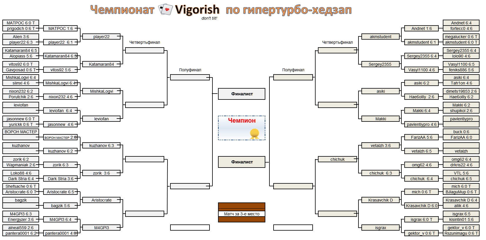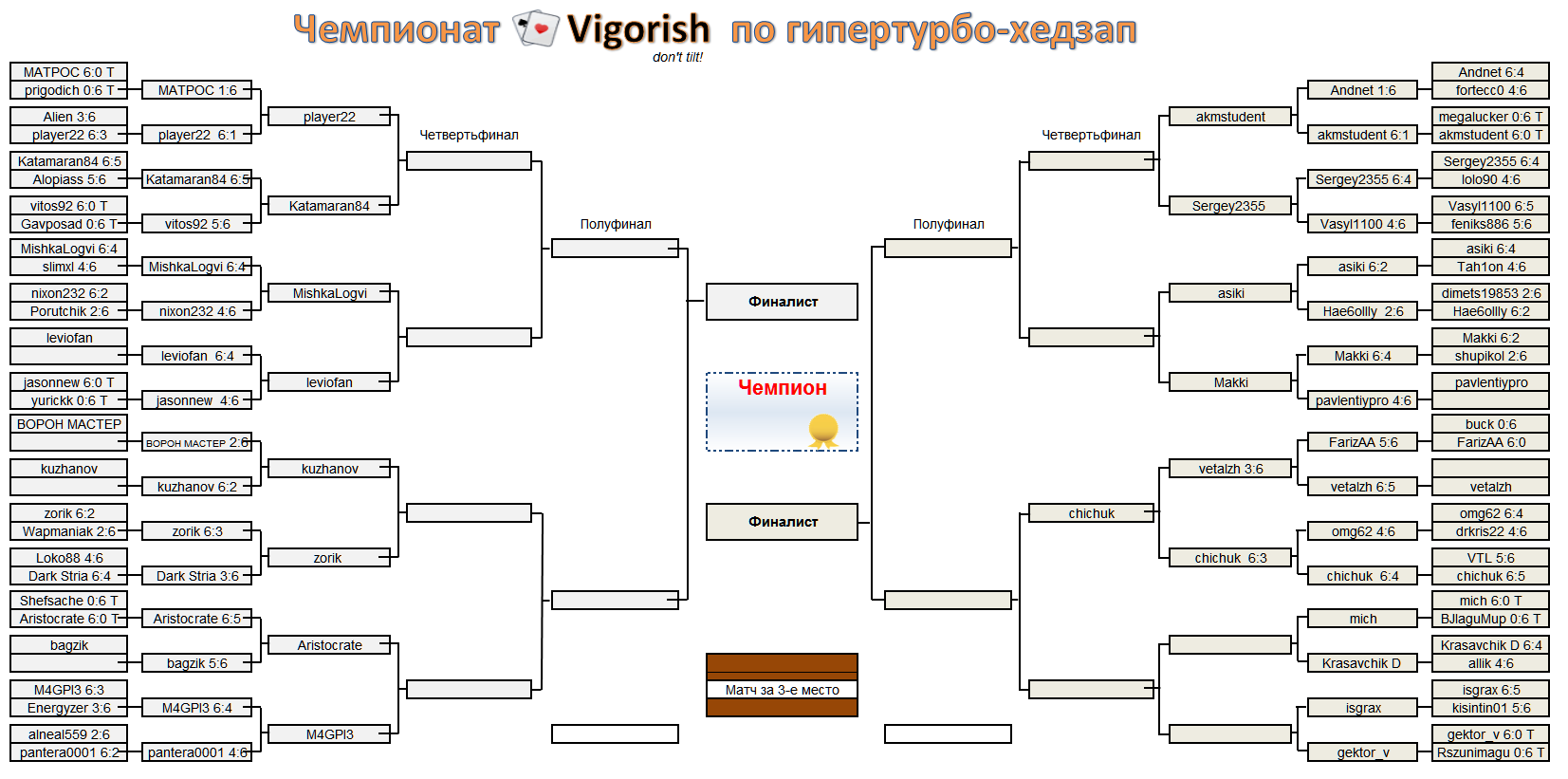 Регламент: 1. Игра идёт в RedKings в специально созданных, приватных хедзап-снг с баином 0.50€ +0.03€ с входом по паролям Сроки проведения: Первый игровой день 1 декабря (окончание Чемпионата будет зависеть от количества участников). 2. После проведения жеребьёвки участники играют матчи в специально созданых приватных sng heads-up superturbo, чтобы сыграть раунд участникам даётся двое суток, в случае не выхода на связь (не явки) участника, ему засчитывается тех.поражение 6:0 и его оппонент проходит дальше. 3. Вплоть до финала во всех раундах игра идёт до 6 побед, минимальное количество сыгранных игр в раунде 6 (счёт 6:0), максимальное 11 (счёт 6:5), таким образом 3-5 евро на счёте RK с лихвой хватит для участия в данном соревновании. Победитель пары сообщает результат в этой теме указав итоговый счёт. 4. Финальная игра и матч за третье место играются до 10 побед. 5. К участию допускаются все пользователи форума Vigorish независимо от привязки к афф программе форума, однако пользователи форума с регистрацией меньше полугода, допускаются только при наличии привязке к афф программе Vigo. Также допускаются все новые игроки имеющие привязку, т.е. зарегистрированные по нашей ссылке* 6. Максимальное количество участников в турнире 64 человека. 7. Призовой фонд: 1 место 200 € 2 место 150 € 3 место 100 € 4 место 50 € 5-8 места по 25 € на счёт 9-16 места бесплатная ставка 5$ в букмекерке RK + 20 free спинов в казино (призы за 9-16 места уточняются) 8. С сегодняшнего дня и по 30 ноября до 17-00 мск идёт регистрация, потенциальные участники оставляют в теме заявки на участие. Игроки зарегистрировавшиеся раньше всех получают преимущество, часть игроков в случае, если не наберется 64 человека, автоматически начинают игру с 1/32 т.е. без игры проходят в следующий раунд. 9. Игрокам следует самим вести счёт по ходу игры, в каждом раунде и рекомендуется делать скриншоты, либо использовать HM/PT4, можете даже видео записать, тут уже ваше дело, всё это на случай спорных ситуаций. Т.к. MPN не сможет предоставить историю для приватных хедзап-снг. Не хочется как организатору оказаться в маловероятной ситуации, когда один говорит я выиграл 6:5, а другой нет это я выиграл 6:5, а доказать не один игрок свою правоту не может, и приходится назначать переигровку под своим контролем и терять время. Предварительный список участников (в списке указаны ники на форуме): 1. BOPOH MACTEP 2. pavlentiypro 3. leviofan 4. kuzhanov 5. bagzik 6. vetalzh 7. asiki 8. vitos92 9. nixon232 10. Makki 11. igsrax 12. alneal559 13. Loko88 14. VTL 15. Sergey2355 16. AlieN 17. Katamaran84 18. Vasyl1100 19. -mich- 20. Shefsache 21. Andnet 22. gektor_v 23. buck 24. jasonnew 25. MishkaLogvi 26. dimets19853 27. Krasavchik Damon 28. M4GPI3 29. zorik 30. omg62 31. megalucker 32. MATPOC 33. prigodich 34. akmstudent 35. drkris22 36. Wapmaniak 37. Energyzer 38. allik 39. Hae6oIIIy 40. slimxl 41. yurickk 42. FarizAA 43. Rszunimagu 44. fortecc0 45. Aristocrate 46. BJIaguMuP 47. feniks886 48. Alopiass 49. player22 50. lolo90 51. chichuck 52. Dark Stria 53. pantera0001 54. kisintin01 55. shupikol 56. Porutchik 57. GavPosad 58. Tah1on Итоговая турнирная сетка:: Распределение призовых мест: 1. Makki 200 € 2. kuzhanov 150 € 3. Krasavchik Damon 100 € 4. player22 50 € 5-8. Mishkalogvi 25 € 5-8. M4GPI3 25 € 5-8. Sergey2355 25 € 5-8. chichuk 25 € 9-16. Katamaran84 - бесплатная ставка 5$ в букмекерке RK + 20 free спинов в казино 9-16. leviofan - бесплатная ставка 5$ в букмекерке RK + 20 free спинов в казино 9-16. zorik - бесплатная ставка 5$ в букмекерке RK + 20 free спинов в казино 9-16. Aristocrate - бесплатная ставка 5$ в букмекерке RK + 20 free спинов в казино 9-16. akmstudent - бесплатная ставка 5$ в букмекерке RK + 20 free спинов в казино 9-16. asiki - бесплатная ставка 5$ в букмекерке RK + 20 free спинов в казино 9-16. vetalzh - бесплатная ставка 5$ в букмекерке RK +