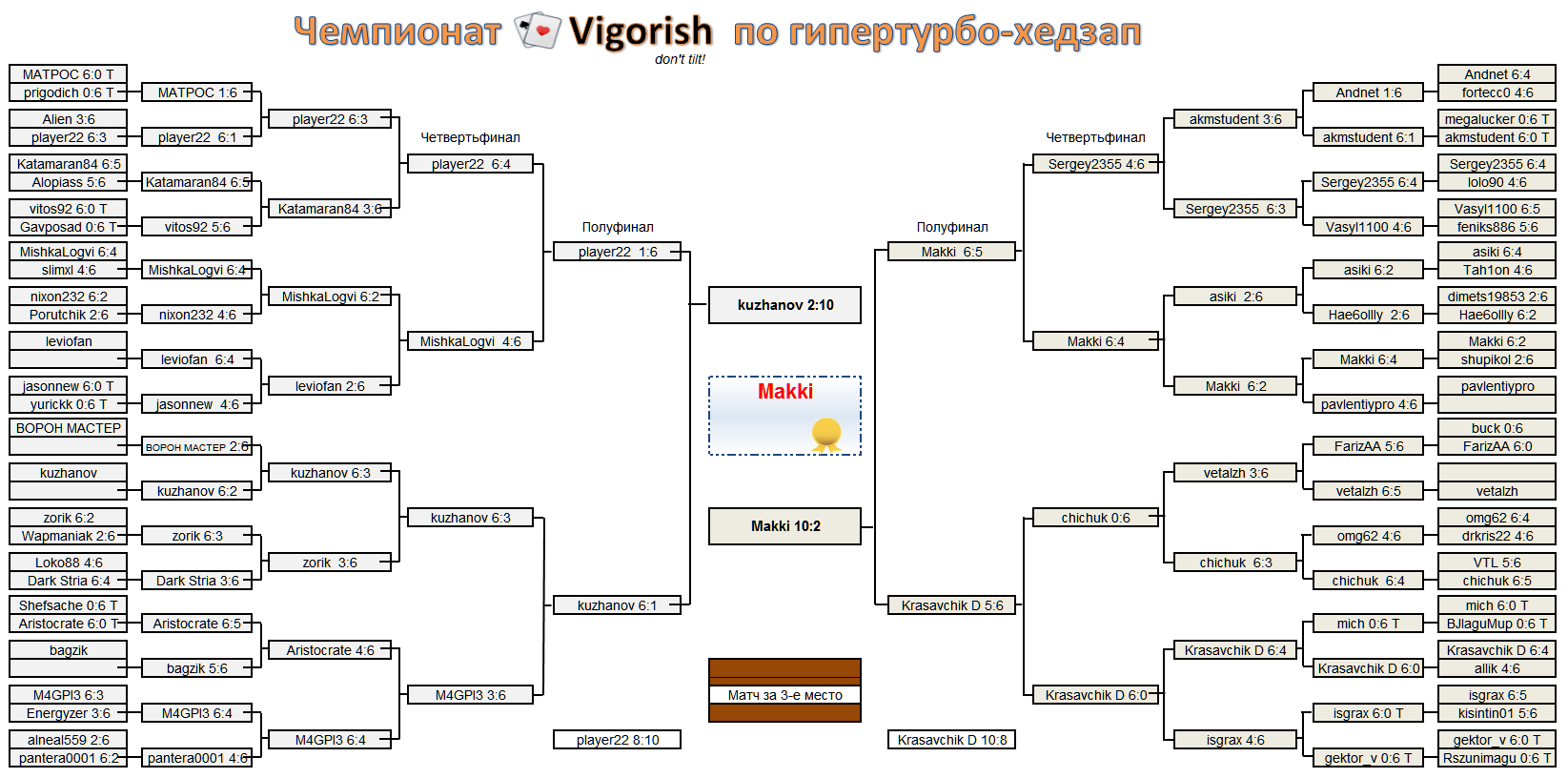Регламент: 1. Игра идёт в RedKings в специально созданных, приватных хедзап-снг с баином 0.50€ +0.03€ с входом по паролям Сроки проведения: Первый игровой день 1 декабря (окончание Чемпионата будет зависеть от количества участников). 2. После проведения жеребьёвки участники играют матчи в специально созданых приватных sng heads-up superturbo, чтобы сыграть раунд участникам даётся двое суток, в случае не выхода на связь (не явки) участника, ему засчитывается тех.поражение 6:0 и его оппонент проходит дальше. 3. Вплоть до финала во всех раундах игра идёт до 6 побед, минимальное количество сыгранных игр в раунде 6 (счёт 6:0), максимальное 11 (счёт 6:5), таким образом 3-5 евро на счёте RK с лихвой хватит для участия в данном соревновании. Победитель пары сообщает результат в этой теме указав итоговый счёт. 4. Финальная игра и матч за третье место играются до 10 побед. 5. К участию допускаются все пользователи форума Vigorish независимо от привязки к афф программе форума, однако пользователи форума с регистрацией меньше полугода, допускаются только при наличии привязке к афф программе Vigo. Также допускаются все новые игроки имеющие привязку, т.е. зарегистрированные по нашей ссылке* 6. Максимальное количество участников в турнире 64 человека. 7. Призовой фонд: 1 место 200 € 2 место 150 € 3 место 100 € 4 место 50 € 5-8 места по 25 € на счёт 9-16 места бесплатная ставка 5$ в букмекерке RK + 20 free спинов в казино (призы за 9-16 места уточняются) 8. С сегодняшнего дня и по 30 ноября до 17-00 мск идёт регистрация, потенциальные участники оставляют в теме заявки на участие. Игроки зарегистрировавшиеся раньше всех получают преимущество, часть игроков в случае, если не наберется 64 человека, автоматически начинают игру с 1/32 т.е. без игры проходят в следующий раунд. 9. Игрокам следует самим вести счёт по ходу игры, в каждом раунде и рекомендуется делать скриншоты, либо использовать HM/PT4, можете даже видео записать, тут уже ваше дело, всё это на случай спорных ситуаций. Т.к. MPN не сможет предоставить историю для приватных хедзап-снг. Не хочется как организатору оказаться в маловероятной ситуации, когда один говорит я выиграл 6:5, а другой нет это я выиграл 6:5, а доказать не один игрок свою правоту не может, и приходится назначать переигровку под своим контролем и терять время. Предварительный список участников (в списке указаны ники на форуме): 1. BOPOH MACTEP 2. pavlentiypro 3. leviofan 4. kuzhanov 5. bagzik 6. vetalzh 7. asiki 8. vitos92 9. nixon232 10. Makki 11. igsrax 12. alneal559 13. Loko88 14. VTL 15. Sergey2355 16. AlieN 17. Katamaran84 18. Vasyl1100 19. -mich- 20. Shefsache 21. Andnet 22. gektor_v 23. buck 24. jasonnew 25. MishkaLogvi 26. dimets19853 27. Krasavchik Damon 28. M4GPI3 29. zorik 30. omg62 31. megalucker 32. MATPOC 33. prigodich 34. akmstudent 35. drkris22 36. Wapmaniak 37. Energyzer 38. allik 39. Hae6oIIIy 40. slimxl 41. yurickk 42. FarizAA 43. Rszunimagu 44. fortecc0 45. Aristocrate 46. BJIaguMuP 47. feniks886 48. Alopiass 49. player22 50. lolo90 51. chichuck 52. Dark Stria 53. pantera0001 54. kisintin01 55. shupikol 56. Porutchik 57. GavPosad 58. Tah1on Итоговая турнирная сетка:: Распределение призовых мест: 1. Makki 200 € 2. kuzhanov 150 € 3. Krasavchik Damon 100 € 4. player22 50 € 5-8. Mishkalogvi 25 € 5-8. M4GPI3 25 € 5-8. Sergey2355 25 € 5-8. chichuk 25 € 9-16. Katamaran84 - бесплатная ставка 5$ в букмекерке RK + 20 free спинов в казино 9-16. leviofan - бесплатная ставка 5$ в букмекерке RK + 20 free спинов в казино 9-16. zorik - бесплатная ставка 5$ в букмекерке RK + 20 free спинов в казино 9-16. Aristocrate - бесплатная ставка 5$ в букмекерке RK + 20 free спинов в казино 9-16. akmstudent - бесплатная ставка 5$ в букмекерке RK + 20 free спинов в казино 9-16. asiki - бесплатная ставка 5$ в букмекерке RK + 20 free спинов в казино 9-16. vetalzh - бесплатная ставка 5$ в букмекерке RK +