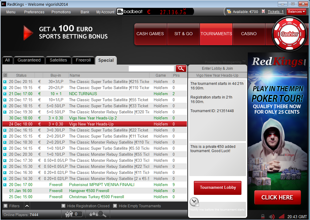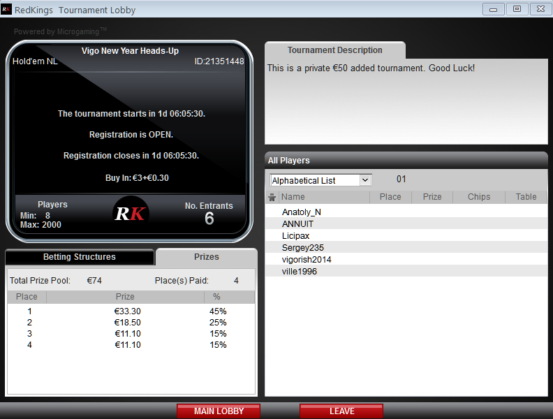 в духе "турнира выходного дня", с небольшим добавленным призовым, только для игроков зарегистрированных в RedKings через Vigorish!