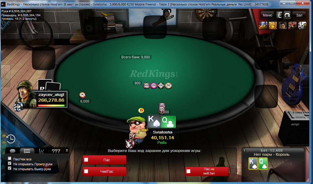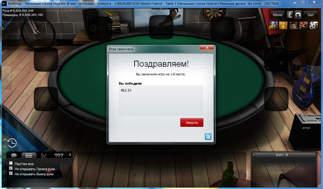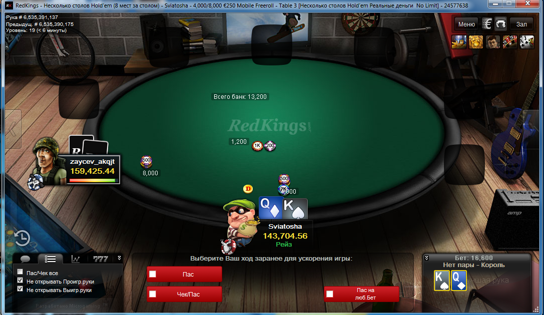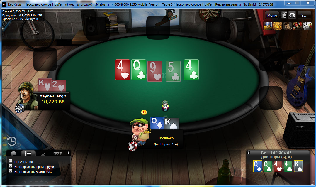 Storo08 HEADS-UP CHALLENGE - название говорит само за себя - я постараюсь сыграть как минимум в нескольких турнирах недели, под ником storo08 Это тренировочные хедзап-шутауты с добавленным призовым фондом, каждую субботу. Регламент: 1. К участию допускаются только игроки зарегистрированные под афф программой Vigorish, по нашей ссылке Либо старые пользователи форума Vigorish, с регистрацией более одного года, независимо от аффилейта. Если вы новичок форума, то вы должны иметь привязку к Vigorish. В случае если у вас старый аккаунт в руме, и вы давно не играли, либо только зарегистрировались, то напишите мне в ЛС свой номер счёта ( заходим на сайт RK, раздел "мой счёт" ) и если это возможно мы привяжем ваш аккаунт к нам. 2. Формат турниров: хедзап-шутаут, superturbo (hyperturbo) Структура: стартовые стеки по 500 фишек, формат супертурбо-хедзап (hyperturbo), но есть минус, уровни 10/20,15/30 и затем сразу 25/50 и 50/100, т.е. как минимум не хватает уровней 20/40 и 30/60, этот минус мы решили компенсировать увеличением продолжительности уровней 3 минуты, вместо 2-х. Минимальное количество участников, чтобы турнир состоялся- 8 человек 3. Участие: в часть турниров вход бесплатный, в часть с небольшим баином. 4. Вход во все турниры по паролям, все пароли высылаются за 1-2 часа до старта первого турнира, посредством личных сообщений. Желающие сыграть турниры должны оставить заявки, после оставленной заявки вы автоматически получаете пароли на все 4 турнира. Заявка в форме отписки в теме: "приму участие", "сыграю","заявка", "обязуюсь сыграть" и т .п., но новые игроки должны написать сперва номер счета. 5. Добавленный призовой фонд имеется во всех турнирах, варьируется в зависимости от месячной активности игроков. Например: в июле это было € 100, в августе € 45, в сентябре € 50 в октябре € 80! и в ноябре € 100! в феврале 2018 года: € 120! в марте 2018 года: € 150! и т.д. в случае активности игроков (приглашайте знакомых и друзей, делайте репосты в соц.сетях и т.п.) он будет увеличен на следующие серии. 6. Найти турниры в лобби легко: турниры (tournaments) специальные (special), далее сортируем по баину, или дате начала. Storo08 heads-up CHALLENGE Новые турниры в апреле: € 140 добавлено: Storo08 heads-up CHALLENGE Freeroll - 6 апреля 21-00 мск Баин: 0 € Добавленный призовой фонд: 25 € Storo08 heads-up CHALLENGE - 13 апреля 21-00 мск Баин: 2+0.20 € Добавленный призовой фонд: 40 € Storo08 heads-up CHALLENGE - 20 апреля 21-00 мск Баин: 5+0.50 € Добавленный призовой фонд: 50 € Storo08 heads-up CHALLENGE Freeroll - 27 апреля 21-00 мск Баин: 0 € Добавленный призовой фонд: 25 € Внимание! В случае проблем со входом на сайт RedKings, или в клиент рума, воспользуйтесь бесплатными ключами для VPN |