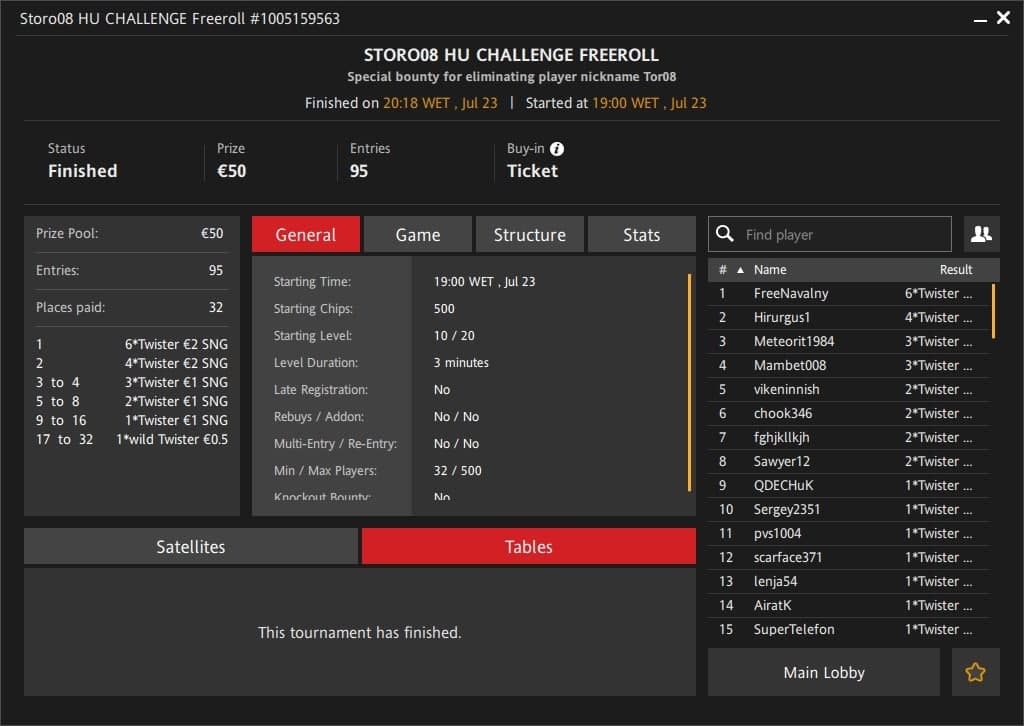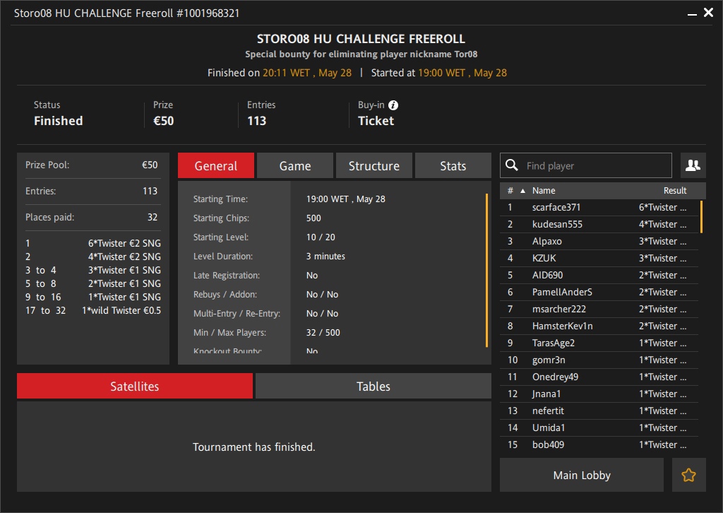 - 3) 32 призовых места во фрироллах +в некоторых определенное баунти € 10+ кэшем тому кто выбьет игрока с ником Tor08