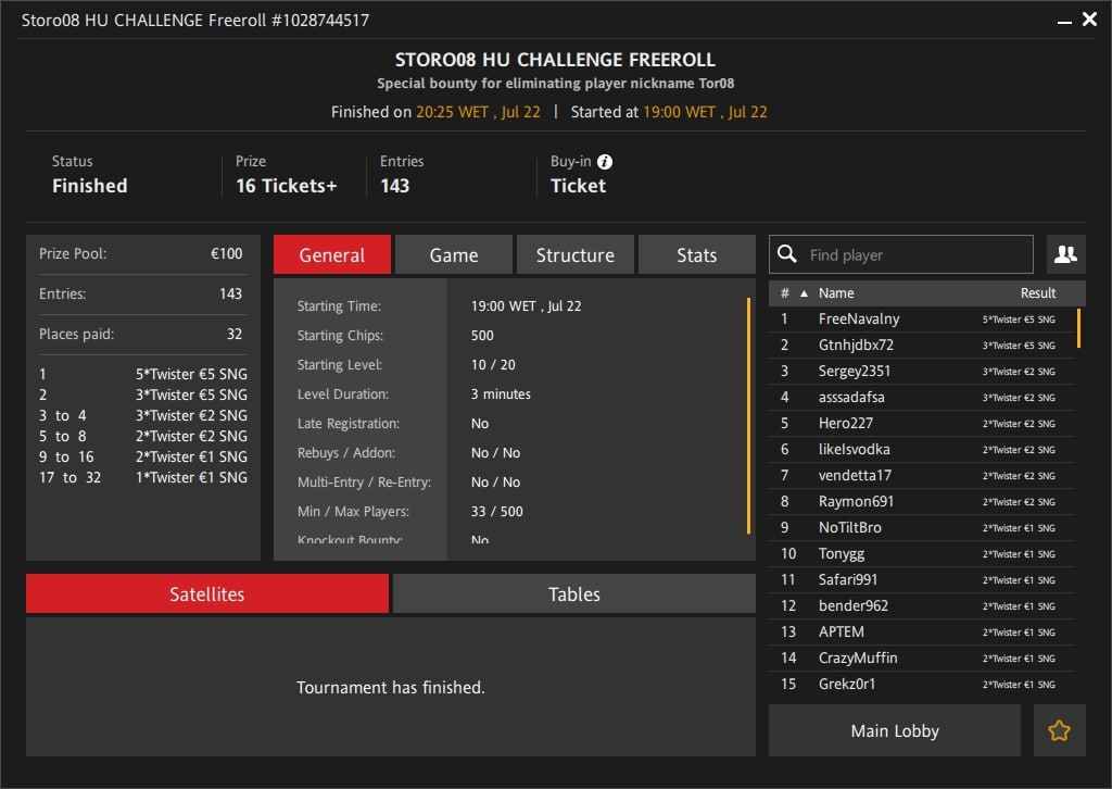 Поздравляем победителя FrееNаvаlnу и всех призёров пятничного турнира "Storo08 Heads-Up Challenge"!