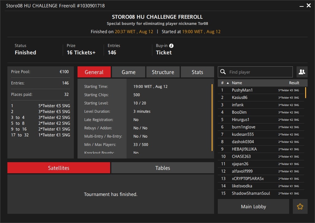 Поздравляем победителя PushyMan1 и всех призёров пятничного турнира с удовенным призовым "Storo08 Heads-Up Challenge"!