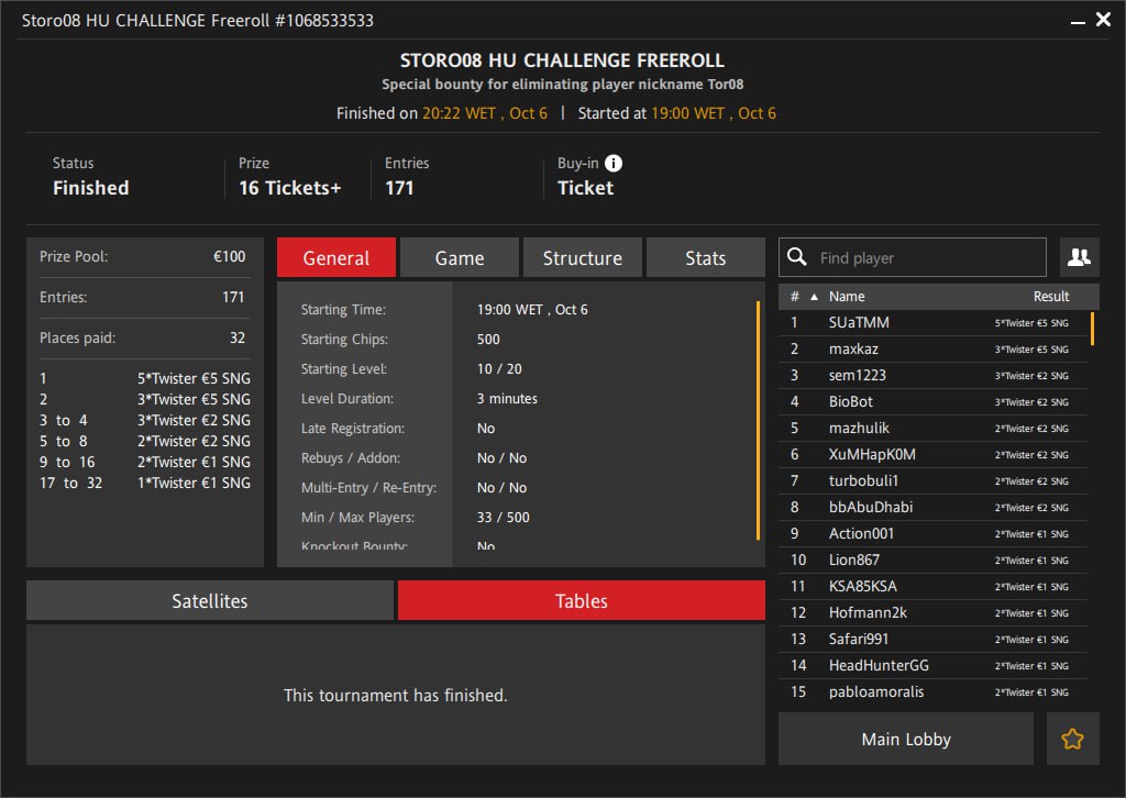 - 3) 32 призовых места во фрироллах +в некоторых определенное баунти € 10+ кэшем тому кто выбьет игрока с ником Tor08