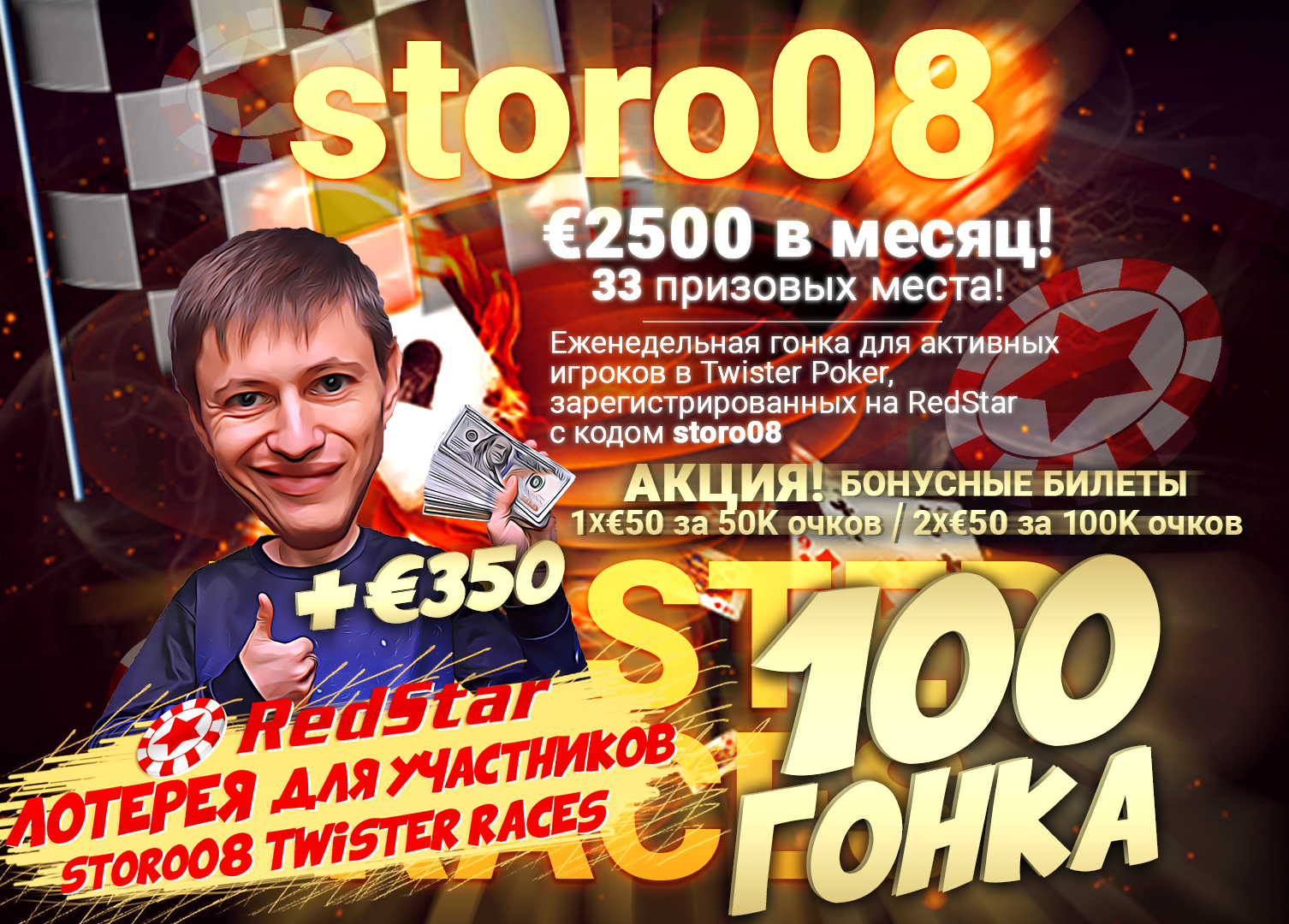 Это - еженедельная гонка для активных игроков TWISTER зарегистрированных в RedStar с кодом: storo08 Условия участия и регистрация: [/b] 1) Гонка идёт параллельно сетевой, лидерборд сетевой доступен только в клиенте, в нём обязательно нужно один раз зарегистрироваться через клиент. 2) Результаты игроков берутся также с лидерборда сетевой гонки (поэтому нужны не только ваши логины, но и игровые никнеймы). Акция будет проводиться на постоянной основе до иного решения администрации. Еженедельный квалификационный период: Понедельник 00:00 GMT - Воскресенье 23:55 GMT. Старт первой гонки: 13 июля - окончание 19 июля в 23:55 GMT и автоматически стартует следующая с 20 июля по 26-ое. Итак далее. Внимание! Наша гонка заканчивается на 5 минут раньше сетевой, по техническим причинам - имейте это ввиду. Претензии по распределению мест, если кто-то кого-то обошёл в сетевой в эти 5 минут, приниматься не будут. 3) Призы. Наша гонка начиналась с 5-ю призами и € 500 призовых в месяц, затем мы увеличили их до € 600, затем удвоили призовые до € 1200, затем до € 1320, затем € 1740 и 25 призовых мест, потом € 1900 и 30 призовых мест! Затем € 2000 и 33 призовых места затем довели до € 2500! Потом подняли до € 3000 и 35 призовых мест! 12 сентября 2022 года новое увеличение призов до € 3500 и 55 призовых мест! Потом мы сделали € 4500 затем € 5000 и вот новый призовой € 5200 и 65 призовых мест! За месяц разыгрываем билетов на € 5200 ! Новые призовые еженедельной гонки: 1. 1х €50+6x €20 Twister Билет 2. 6x €20 Twister Билет 3. 5x €20 Twister Билет 4. 4x €20 Twister Билет 5. 3x €20 Twister Билет 6. 5x €10 Twister Билет 7. 4x €10 Twister Билет 8. 7x €5 Twister Билет 9. 6x €5 Twister Билет 10. 5x €5 Twister Билет 11-14. 4x €5 Twister Билет 15-30. 3x €5 Twister Билет 31-49. 2x €5 Twister Билет 50-65. 1x €5 Twister Билет ДЕЙСТВУЕТ АКЦИЯ: набравший 50k очков за неделю, получает дополинительный приз: 1x €50 Twister Билет, за 100k также дополнительный приз: 1x €50 Twister Билет 4) В случае достижения одинакового количества очков двумя или более игроками, в учет будет взято количество сыгранных турниров. Игрок, сыгравший больше Twister игр, займет более высокую позицию в лидерборде. 5) Зачисление призов и итоговый лидерборд в понедельник или вторник. 6) Для участия необоходимо зарегистрироваться в гонке, для этого нужно оставить заявку в этой тему и НАПИСАТЬ СВОЙ ЛОГИН в руме +игровой НИКНЕЙМ. Или написать логин+ник мне в ЛС. Менять никнейм во время гонки НЕЛЬЗЯ и если вы его поменяли, то обязательно нужно сообщить в данной теме. После оставления заявки на участие вы автоматически включаетесь в обсчёт данной гонки. Повторные заявки оставлять НЕ НУЖНО. Лидерборд нашей гонки теперь находится здесь: https://storo08.ru/twister-races/ ********* Регистрация открыта! |