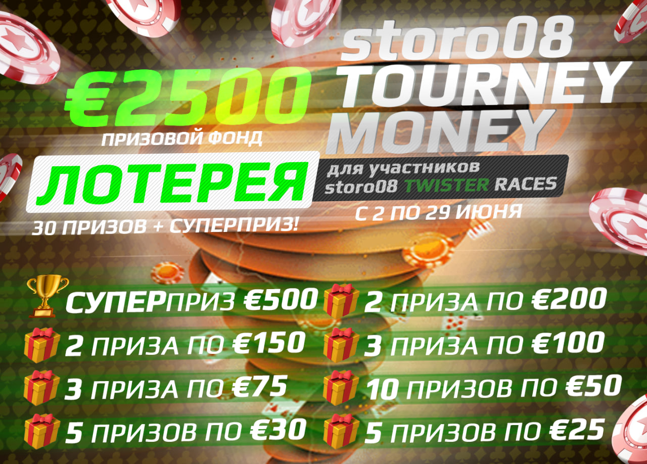 Это - еженедельная гонка для активных игроков TWISTER зарегистрированных в RedStar с кодом: storo08 Условия участия и регистрация: [/b] 1) Гонка идёт параллельно сетевой, лидерборд сетевой доступен только в клиенте, в нём обязательно нужно один раз зарегистрироваться через клиент. 2) Результаты игроков берутся также с лидерборда сетевой гонки (поэтому нужны не только ваши логины, но и игровые никнеймы). Акция будет проводиться на постоянной основе до иного решения администрации. Еженедельный квалификационный период: Понедельник 00:00 GMT - Воскресенье 23:55 GMT. Старт первой гонки: 13 июля - окончание 19 июля в 23:55 GMT и автоматически стартует следующая с 20 июля по 26-ое. Итак далее. Внимание! Наша гонка заканчивается на 5 минут раньше сетевой, по техническим причинам - имейте это ввиду. Претензии по распределению мест, если кто-то кого-то обошёл в сетевой в эти 5 минут, приниматься не будут. 3) Призы. Наша гонка начиналась с 5-ю призами и € 500 призовых в месяц, затем мы увеличили их до € 600, затем удвоили призовые до € 1200, затем до € 1320, затем € 1740 и 25 призовых мест, потом € 1900 и 30 призовых мест! Затем € 2000 и 33 призовых места затем довели до € 2500! Потом подняли до € 3000 и 35 призовых мест! 12 сентября 2022 года новое увеличение призов до € 3500 и 55 призовых мест! Потом мы сделали € 4500 затем € 5000 и вот новый призовой € 5200 и 65 призовых мест! За месяц разыгрываем билетов на € 5200 ! Новые призовые еженедельной гонки: 1. 1х €50+6x €20 Twister Билет 2. 6x €20 Twister Билет 3. 5x €20 Twister Билет 4. 4x €20 Twister Билет 5. 3x €20 Twister Билет 6. 5x €10 Twister Билет 7. 4x €10 Twister Билет 8. 7x €5 Twister Билет 9. 6x €5 Twister Билет 10. 5x €5 Twister Билет 11-14. 4x €5 Twister Билет 15-30. 3x €5 Twister Билет 31-49. 2x €5 Twister Билет 50-65. 1x €5 Twister Билет ДЕЙСТВУЕТ АКЦИЯ: набравший 50k очков за неделю, получает дополинительный приз: 1x €50 Twister Билет, за 100k также дополнительный приз: 1x €50 Twister Билет 4) В случае достижения одинакового количества очков двумя или более игроками, в учет будет взято количество сыгранных турниров. Игрок, сыгравший больше Twister игр, займет более высокую позицию в лидерборде. 5) Зачисление призов и итоговый лидерборд в понедельник или вторник. 6) Для участия необоходимо зарегистрироваться в гонке, для этого нужно оставить заявку в этой тему и НАПИСАТЬ СВОЙ ЛОГИН в руме +игровой НИКНЕЙМ. Или написать логин+ник мне в ЛС. Менять никнейм во время гонки НЕЛЬЗЯ и если вы его поменяли, то обязательно нужно сообщить в данной теме. После оставления заявки на участие вы автоматически включаетесь в обсчёт данной гонки. Повторные заявки оставлять НЕ НУЖНО. Лидерборд нашей гонки теперь находится здесь: https://storo08.ru/twister-races/ ********* Регистрация открыта! |