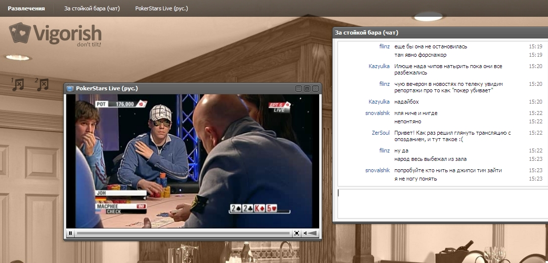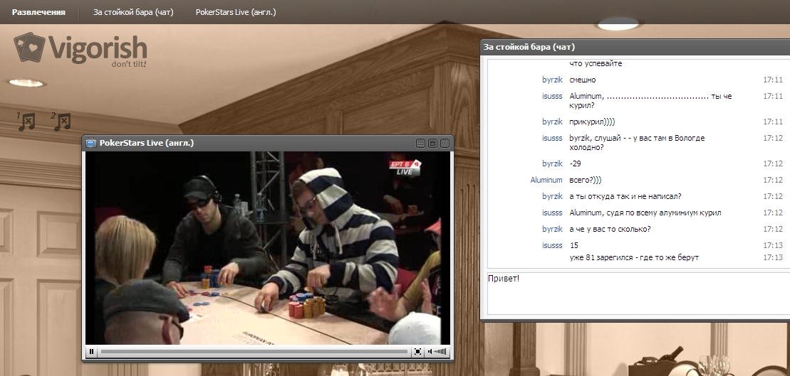 Прямой эфир в Баре Vigorish -> http://www.vigorish.ru/bar/ (вкладка "Развлечения" -> "Покер-ТВ" -> "PokerStars Live (англ.)")