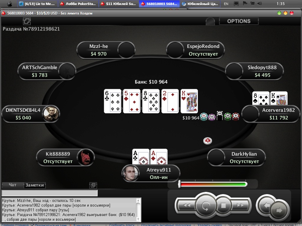 Я уже три раза в олл-ин высталялась с большими стеками и все проиграла. Самый эпичный за пот в 18.000 с А3 бубей (флеш-дро) против ку-ку, джей-джей и рандомной шняги с ББ. На терне флеш, на ривере фулл. Осталось 3 тыщонки, но уже крутанулась до 12-ти. Последний раз редактировалось oksaxa 15 апр 2012, 22:02, всего редактировалось 1 раз.