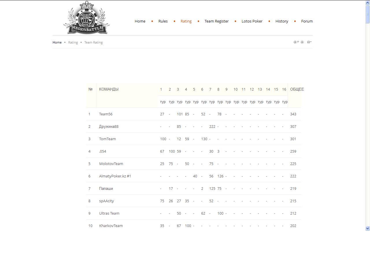 "Приглашаю вас на командный чемпионат по покеру , в котором принимают участие покер форумы и частные команды. Призовой фонд чемпионата выше 50 000$ + 4 призовых пакета на лайф турнир в Праге. Вкратце о чемпионате: в команде по 5 игроков(от форума неограниченное количество команд) , в рамках чемпионата пройдет 16 турниров (2 из которых фрироллы на 1000 и 1500$), общая гарантия в турнирах чемпионата 25 000$. В каждом турнире игроки зарабатывают рейтинговые очки (топ 40 игроков по итогам каждого из турнира получают очки), которые идут в зачет лучших игроков чемпионата, в командный зачет идут 3 лучших результата из 5 в каждом турнире. По итогам чемпионата лучшие команды и лучшие игроки получают денежные призы + 4 лучших по рейтингу игрока поедут на лайф турнир в Прагу. Рум Lotos Poker сеть 888 покера Live Event состоится в рамках Prague Poker Festival. Турнир пройдет в Праге 12-13 декабря 2012 года. Общая стоимость каждого призового пакета: 1 200 Euro (бай-ин €550 + 3 ночи в пятизвёздочной гостинице Corinthia + €350 на карманные расходы/дорогу)." Ссылка на правила на сайте битвы http://regionbattle.ru/index.php/rules для участия во фрироле на 1500$ требуется статус хром, нужно набрать 12,5$ рейка на остальные турниры и стартовый фриролл никаких статусов не нужно Команды форума "по банкроллу" 1. MishkaLogvi 2. Dimets 3. GoldenState21 4. megalucker 5. Energyzer 1.allekcey 2.Katamaran_84 3.easyd1m 4.Cippolla 5.play thebest Ленивцы 1. DiamondHead 2. KonAs 3. format 4. spartak2009 5. alneal559 Старая гвардия 1. Чуча 2. asiki 3. Sunuok 4. Lombardy4 5. Sheval "Подарочный набор" : 1. NoPair 2. soulreaver 3. Yaroslav_M 4. V_Prince 5.ItzA777 "Папаши" 1.AzArt1st 2.ExtraVision 3.Bagzik 4.Achinsk24 "с блэкджеком и шлюхами"(с) 1. VolfgangCSKA 2. unspeak 3. Sn2 4. LOUIS 5. ruspride88 Последний раз редактировалось Sunuok 11 окт 2012, 11:52, всего редактировалось 17 раз(а).
