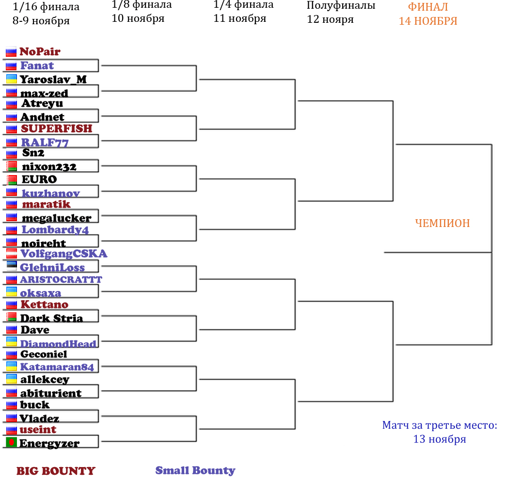 Ни в каком другом виде покера мастерство не играет такой решающей роли как в игре один на один. Есть только ты, твой соперник и дилер. Здесь играют не карты - здесь играют своего оппонента. Здесь не получится отсидеться - каждое твое решение может быть решающим. Мы постараемся выявить самого умелого, самого стойкого и самого подготовленного игрока к таким условиям. Vigorish.ru при поддержке Pokerstars.com запускает новый и, как мы надеемся, долгосрочный проект под названием "Кубок Виго" по Heads-Up турнирам. Кубок будет состоять из 4х этапов: 1. Осень 2012 - ХА СНГ НЛХ 2. Зима 12/13 - ХА СНГ ПЛХ 3. Весна 2013 - ХА СНГ Омаха Хай 4. Лето 2013 - ХА СНГ НЛХ Турбо в Августе 2013 пройдет Суперфинал - Топ 8 в итоговом зачете играют за приз!(какой именно будет объявлено ближе к событию) Количество участников: Лимитировано на 64 человека Вход в турнир: 10$ каждый из этапов. Перевод будет осуществлен на счет Pokerstars.com Мэджикбету - он гарант турнира, независимое лицо не принимающее в нем участие! Плюс вход в каждый отдельный турнир оплачивается отдельно. Это 1.10$ Формат проведения: Все участники будут разбиты на пары. Участники пар между собой договариваются о времени. В день играется только один раунд турнира. Будет составлена сетка наподобие теннисной: http://www.championat.com/tennis/_wta/867/grid.html Победитель в паре будет выявляться в серии до 3х побед до четвертьфинала, четвертьфинал и полуфинал до 4 побед, ну и финал соответственно до 5 побед. Призовой фонд: Основной - макс. 640$ + 225$ баунти Место проведения: Pokerstars - Лобби Private. Требования к участникам: Регистрация на форуме не меньше двух месяцев и положительная репутация. Расписание: 1-2 Игровые дни = 1/32 финала 3-4 Игровые дни = 1/16 финала 5 Игровой день = 1/8 финала 6 Игровой день = 1/4 финала 7 игровой день = полуфиналы 8 игровой день = финал Первые два раунда играются в два дня, так как много пар,дальше в 1 день. По максимуму матчей будут показаны в прямой трансляции на нашем канале. Призовые выплаты: Структура ИТМ зависит от количества участников и объема призового фонда. Бонусы: За 5 топовых игроков с форума будет назначен баунти в размере 25$. Еще за 10 игроков будет назначен малый баунти в размере 10$. Состав групп будет указан по окончании регистрации. Участники за которых будет внесен баунти обязаны сами оплатить свой БИ. Победитель получит "Кубок Виго" по почте Итоговая таблица По итогам 4х этапов будет подсчитан окончательный рейтинг. Очки для рейтинга распределяются следующим образом: 10 очков = 1/32 финала 20 о. = 1/16 финала 30 о. = 1/8 финала 40 = 1/4 финала 50 = 4ое место 60 = 3ье место 75 = финал 90 = победитель Регистрация в турнир: начинается за месяц до старта и кончается за 7 дней до старта. Форумные отличия: Победитель каждого из этапов получает рядом с ником статус победителя этапа ровно до проведения этого этапа через год уже в новой серии. Победитель суперфинала получит статус пожизненно) Итоги этапов: Первый этап - HU NLH Актуальный рейтинг: 1. kuzhanov - 90 2. Dark Stria - 75 3. Fanat - 60 4. Sheval - 50 5-8. noireht - 40 5-8. Glehni Win - 40 5-8. SUPERFISH - 40 5-8. useint - 40 9-16. buck - 30 9-16. allekcey - 30 9-16. DiamondHead - 30 9-16. oksaxa - 30 9-16. megalucker - 30 9-16. nixon232 - 30 9-16. Atreyu - 30 9-16. max-zed - 30 17-32. NoPair - 20 17-32. Yaroslav_M - 20 17-32. Andnet - 20 17-32. RALF777 - 20 17-32. Sn2 - 20 17-32. EURO - 20 17-32. maratik - 20 17-32. Lombardy4 - 20 17-32. VolfgangCSKA - 20 17-32. ARISTOCRATTT - 20 17-32. Kettano - 20 17-32. Dave - 20 17-32. Katamaran84 - 20 17-32. abiturient - 20 17-32. Vladez - 20 17-32. Energyzer - 20 Зал Славы: Последний раз редактировалось VolfgangCSKA 16 ноя 2012, 23:13, всего редактировалось 28 раз(а).