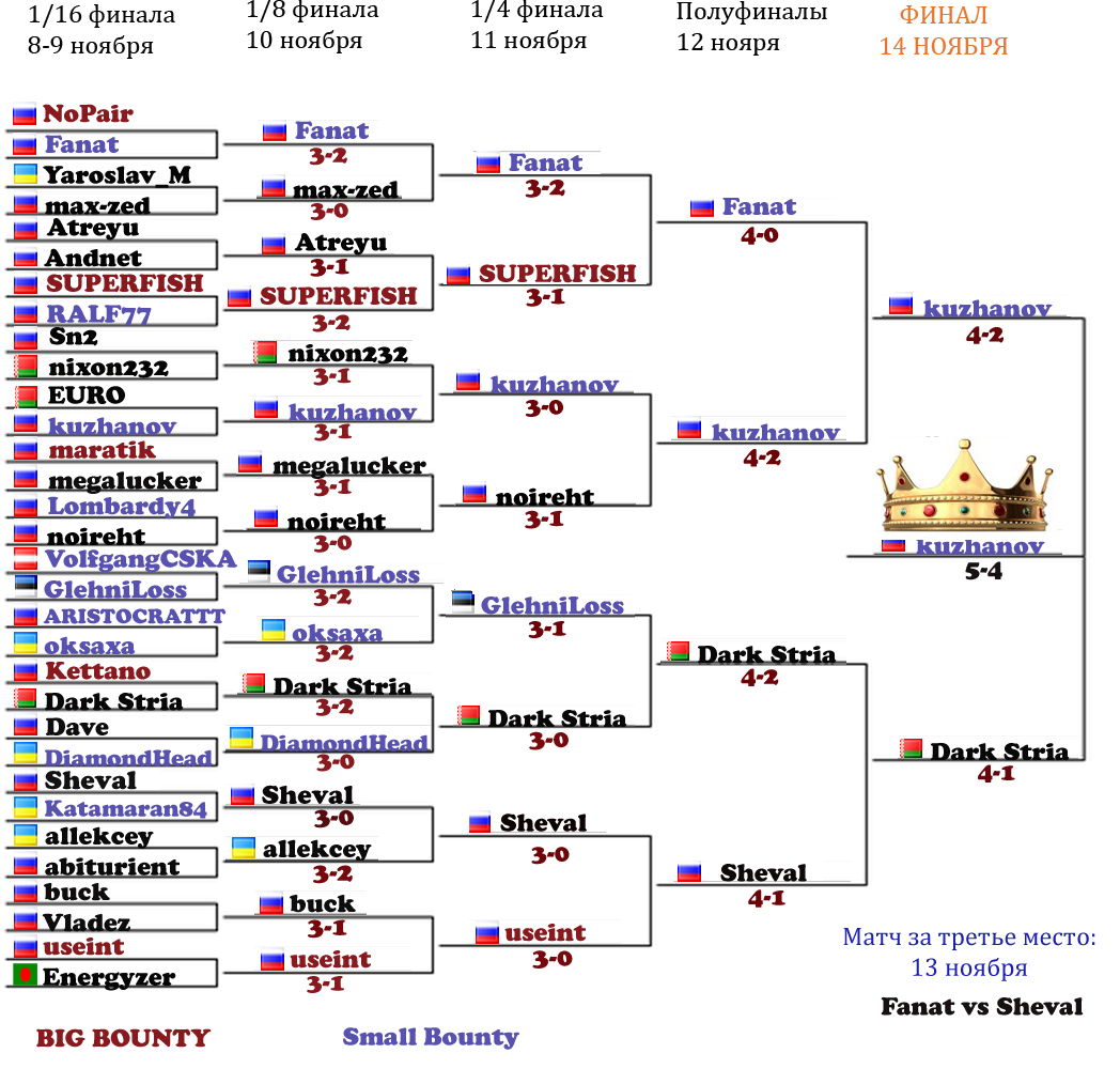 Ни в каком другом виде покера мастерство не играет такой решающей роли как в игре один на один. Есть только ты, твой соперник и дилер. Здесь играют не карты - здесь играют своего оппонента. Здесь не получится отсидеться - каждое твое решение может быть решающим. Мы постараемся выявить самого умелого, самого стойкого и самого подготовленного игрока к таким условиям. Vigorish.ru при поддержке Pokerstars.com запускает новый и, как мы надеемся, долгосрочный проект под названием "Кубок Виго" по Heads-Up турнирам. Жеребьевка будет произведена по принципу частичного рандома как в теннисе и положена на базу турнирной сетки как в теннисе. Наши 5 зубров будут разведены по сетке так что они не смогут встретится раньше четвертьфинала. Все остальные участники будут разбросаны в совершенно случайном порядке по парам с помощью генератора случайных чисел ( http://www.random.org/ ) . Жеребьевка будет показана через наш собственный приватный канал. Ссылка на трансляцию будет доступна ближе к началу жеребьевки! За жеребьевкой наблюдать и давать свои комментарии сможет любой желающий в скайпе. Кто хочет присоединиться добавьтесь в скайп vlady.klos и отпишите сюда о желании принять участие. Я вас добавлю в конференцию Итоги: Свяжитесь со своим оппонентом и договоритесь о времени игр У вас есть два дня с 8го - по 9ое ноября чтобы сыграть свои матчи. В случае возникноваения трудностей обращайтесь мне в ЛС или пишите в основную ветку турнираПишите сюда о том на какое время договорились и какие результаты матчей! Топик с регистрациями: /section84/topic9678.html Секрет: требуется 1 сообщений У вас не достаточно сообщений для просмотра этого секрета."Вечерний ViGo": Макс"SUPERFISH" и RALF777 открыли VigoCup VigoCup набирает обороты! VigoCup: День 1А Вечерний ViGo. #4; Обзор темы "Мазы,Ставки и Пари на Кубок Виго" Вечернй ViGo #5 : Maratik vs Megalucker -- Остался ли порох? вечерний ViGo #6: Жара-Жара Вечерний ViGo #7:Жара-Жара (part II) Вечерний ViGo #8: Жара-Жара (part III-IV) Вечерний ViGo #10: На пути в 1/8... Вечерний ViGo #11: День 1В - итоги Вечерний ViGo #12: Day II -- пан или пропал Вечерний ViGo #13: Day II - осторожно, двери закрываются! Вечерний ViGo #14: Day III: "о чем вообще речь? что за день 3? кубок виго? я не в куррсе рребят"(c) 426992 Последний раз редактировалось VolfgangCSKA 15 ноя 2012, 14:26, всего редактировалось 20 раз(а).