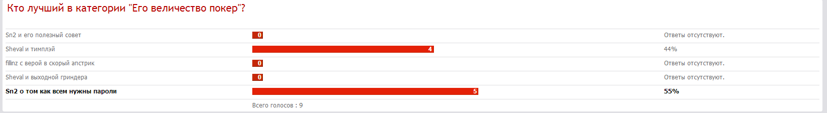 Голоса принимаются до 8го мая 23:59 по мск...Как только определим победителя в этой категории начнем голосование среди номинатов в категории "Его величество покер"