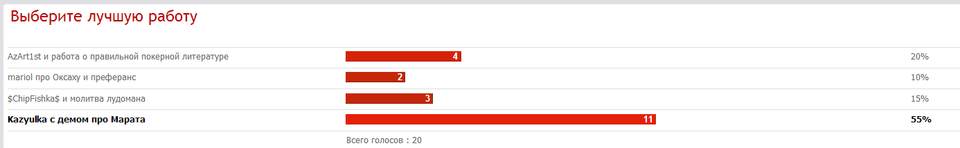 Ну что ребята,ударим креативом по форуму? Предлагаем вашему вниманию конкурс на лучший демотиватор/комикс/фотожабу в двух категориях с ежемесячным призовым фондом в 50$! Призы будут разыграны в двух категориях: Лучший демотиватор/комикс/фотожаба на тему "Виго и его обитатели" с ежемесячным призовым в фондом в 25$ В этой категории можно смело троллить друг друга - чем ироничней и смешней получиться,тем больше шансов на победу! Победитель декабрьского конкурса AzArt1st: Лучший демотиватор/комикс/фотожаба на тему "Его величество покер" с ежемесячным призовым в фондом в 25$ Тут шутим и смеемся надо правилами игры,над покер-румами,профессиональными игроками и т.д. Победитель декабря - KAHAPbI : ВНИМАНИЕ! Важно чтобы ваши творческие изыски были оригинальными, а не скопированными с какого-то другого ресурса. Поэтому приделывайте к вашей картинке логотип Виго. Все копипастеры будут исключены из конкурса! Как прикрепить картинку к сообщению написано здесь, см. /post7837.html#p7837 Как будем определять победителя? Организаторы конкурса выберут по 5 самых интересных работ на наш взгляд и выставят их на общее голосование 1го числа каждого месяца. Желаю всем успехов! Материалы и логотип: |