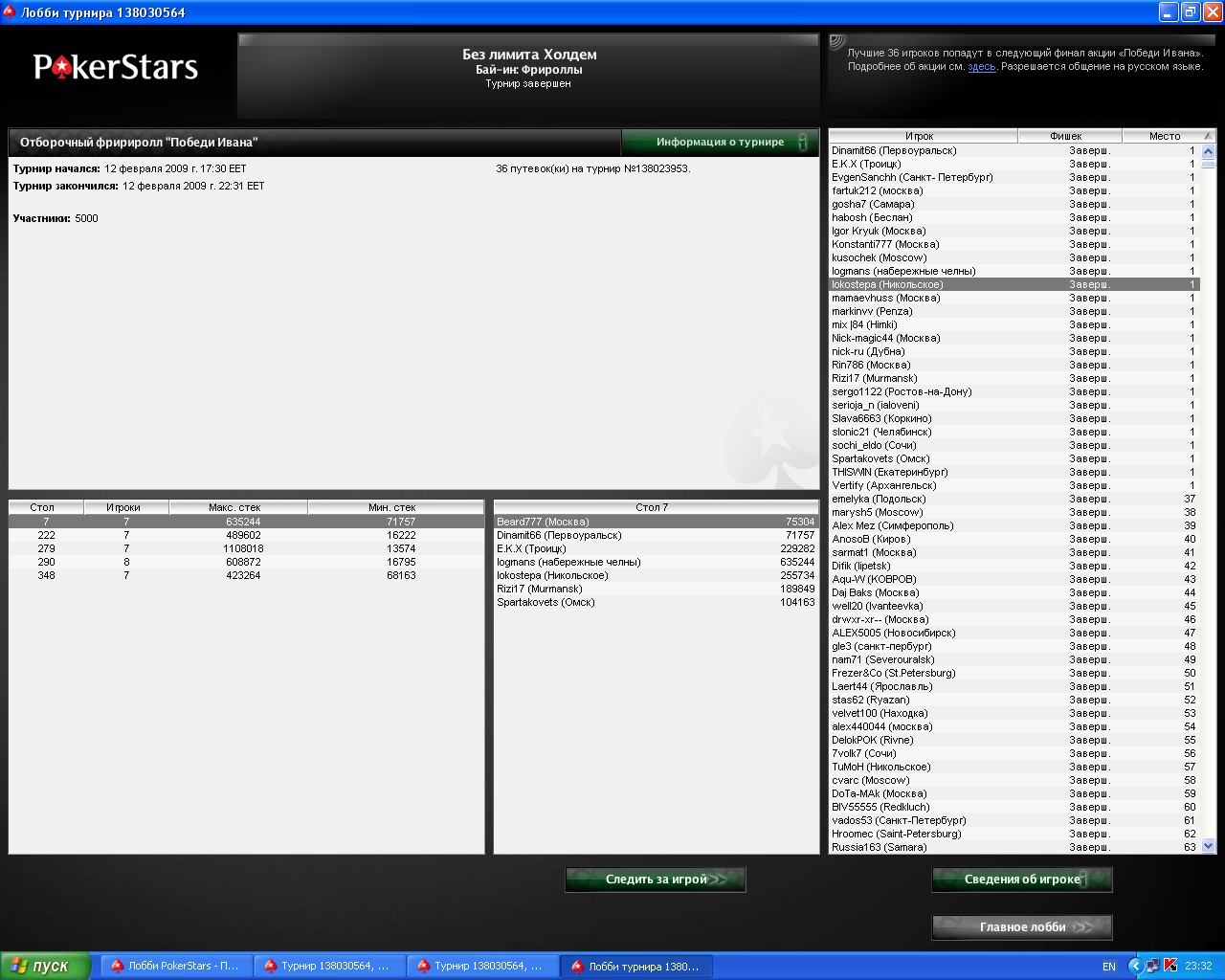 В этом году 27-летний российский игрок Иван Демидов, представлявший PokerStars.NET на самом престижном турнире планеты Главном Событии Мировой Серии Покера (World Series of Poker) 2008*, занял второе место, уступив датчанину Питеру Истгейту, и выиграл более $5 миллионов. Теперь же PokerStars.NET предлагает Вам шанс сыграть с Иваном за денежные призы и поездку на Большой Финал Европейского Покерного Тура в Монте-Карло (EPT Monte Carlo Grand Final)! И все это абсолютно бесплатно! Для этого необходимо принять участие в ежедневных отборочных фрироллах, на которых можно выиграть место в финале. В разделе «Как выиграть путевку» Вы найдете более подробные сведения о фрироллах. Большой Финал в Монте-Карло – это самый главный турнир Европейского Покерного Тура (European Poker Tour), который будет проходить с 28 апреля по 3 мая 2009 г. в Монте-Карло. В прошлом году победу на этом турнире одержал Глен Чорны, заработавший более €2 миллионов. А в этом году, благодаря нашей акции, именно Вы можете стать следующим обладателем огромного приза, не потратив при этом ни цента!. подрбности тут http://www.pokerstars.net/ru/poker/promotions/win-ivan/ Недавно письмецо на мыло об этой акции и решил попробовать, в принципе в день есть две попытки затащить путевку на месячный финал, но т.к. у меня денюжки на старзах уже давно закончились, то решил сыграть фрирол пробовал до этого уже раз 5-6 но дальше одного часа игры не просиживал, не получалось долго играть но вчера придумал великолепное решение я посадил за комп свою девушку, а сам сел в сторонке и говорил ей что делать, ну там чек, фолд, рейз и т.п. и что же вы думаете через 5 с лишним часов мы вместе с ней затащили этот фрирол и вот что я понял слишком долгие турниры я не могу играть просто не хватает усидчивости, а так вот как бы смотря со стороны могу сидеть очень долго, так мыслю спокойно и рационально,а только дотронусь до мышки так сразу эмоции бьют через край вот так вот... p.s. кстати отборочный турнир с байном 1$ затащить намного легче , ведь там играют не 5000 человек, а где то около 350...