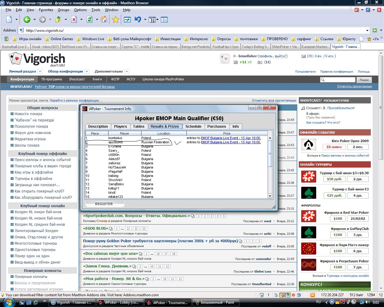 и в итоге ее осуществил. С тех пор рошло почти полгода, я перешел на дешевые снг, кэш на микролимитах, но и фрироллы не забываю совместо с приватниками недорогими бай-инчиками.Не так давно все мы внимательно следили за потрясающим для форума успехом asiki, выигравшему саттелит на Irish Open. Честно скажу, во многом это событие заставило меня вноаь вернуться к МТТ и я подумал - а почему бы в течении нескольких месяцев целому ряду форумчан не затащить целый ряд сателлитов и не отправиться покорять Европу и мир. И вот несколько недель назад чисто случайно наткнулся на рум i4poker (http://www.i4poker.com/) в моей любимой сети энтракшн. Рум мало чем примечателен, единственное что обещали за деп в 50 евро и несколько очков pp выслать нахаляву комплект покерных карт да фирменную футболку Не то чтобы я бонусхантер особый но решил выполнить крайне легкие условия отыгрыша. Так получилось что в это время одновременно на руме проходили и сателлиты по 2 евро на сегодняшний суперсаттелит с бай-ином 50 евро, где и разыгрывалась путевка на очередной этап EMOP. Решил сыграть под впечатлением от учпеха asiki, затащил и вышел в суперсаттелит сегодня.Турнир проходил довольно быстрый. 50е бай-ин, фризаут, стек 300, блайнды по 12 минут. Поскольку путевку на лив ивент получали только двое, в начале играли все довольно тайтово. Однако именно тут я столкнулся с первыми проблемами. Примерно минут через 10 неудачно сблефовав с AQ, потерял почти 2000, попав на 10 10 и сместился на последнюю позицию. Это был пожалуй самый сложный момент, во-первых, сложилась репутация лузового агрессора за столом, во-вторых, блайнды скоро были уже 50/100. Тем не менее кое-как дожив на краже блайндов оленя до 1500, поймал 88, ответил на рейз в 400 all-inом плюс в игру вошел еще одни. В итоге на флопе 8, на терне 8, опп показывает АА, я довольен утроением. Более менее подтянувшись к основной массе решил не искушать судьбу и играть тайтово. В течении еще минут 20, сыграл наверно 3-4 полноценных руки, повысив стек еще на 2500. Затем выбил оппа с маленькми стеком пошедшим ва-банк с 10 10 и нарвавшимся на мои JJ, в итоге к финальному столу где-то через час подошел 4-5-ым. Здесь уже старался активно воровать блайнды, так как они уже были немалыми. по сути был одни явный чиплидером с 3-х кратным стеком от второго места, который и выиграл без особых проблем тур. 4-5 человек (я в том чсиле) шли нога в ногу. Здесь стоит мне поблагодарить чиплидера который и за финалкой выбил аж 3-их оппов, в том числе шедшего 3-им. Затем и я поймал птицу удачи в виде АА, имея где-то 15к, получил олень от оппа с 9к фишек с AQ, и после этой раздачи стал уже 2-ым. По сути до тех пор пока не оставалось 3 человек уверенно защищал свой стек. Затем начались выкрутоса шедшего 3-им, который имея на 8к меньше чем у меня оленил из 10 рук 6-7 точно. Как назло мне действительно сильного ничего не приходило, а с А5 я как игрок больше тайтовый не решался колить. Чиплидер кажись совсем уснул, доходило до того, что он делал рейз в 5000, получал в ответ олень, и не сбрасывал не доставив где-то 10к. Вобщем какое-то время я так даже опустился до 3-го, но затем опп вместо оленя сделал рейз и я KJ решил его переставить. Тот явно блефовал и скинул, а в следующей раздаче его all-in заколил проснувшийся чиплидер с АА, Вот так эффективно закончился тур, а мы вдвоем с представителем Болгарии получили путевку в Болгарию.Коротко о турнире: Golden Sands Res