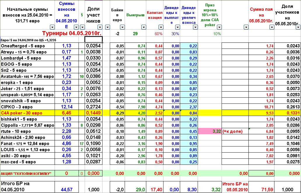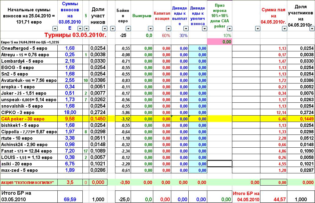 Для тех кто еще не в курсе, организовывается коллективный бэккинг, для игры в хороших турнирах, в целях сплочения рядов, улучшения скилла и наживы денег. Список вкладчиков и суммы (доли) на 21.12.2011г. Порядок расчетов: 1 Взносы участников суммируются и определяется доля каждого по отношению к БР на момент старта турнира (в течение турнира взносы не принимаются) а) Взнос С4А poker учитывается обычном порядке, но вывод средств не допускаеться, а направляеться на увеличение БР копилки (по достижении суммы доли С4А poker е1000 часть, но не больше 30%, может быть использована С4А poker по своему усмотрению). 2 При распределении дивидендов применяются следующие правила: а) Дольщикам выплачивается, согласно долям 30% суммы выигрыша, но не меньше е5 (сумма меньше добавляется к первоначальному взносу (сумме взноса перед турниром-заносом) и увеличивает долю участника при распределении последующих выигрышей) б) 60% идет на капитализацию БР копилки (по достижении суммы в е1000 пропорция может быть пересмотрена в сторону увеличения выплат) в) 10% (и рейкбек) выплачивается игроку или по желанию добавляется во взнос-долю участника. г) Игрок дополнительно премируеться в размере 10% доли С4А poker 3 При уменьшении суммы БР меньше первоначального в 2 раза дивиденды не выплачиваются (кроме 10% игрока) 4 Доля одного пайщика не может превышать 50% от суммы копилки. (в случае превышения производиться автоматическое перечисление денег пайщику. (прим. в случае с С4А poker сумма превышающая порог, распределяется между пайщиками в пропорции равной вкладам на момент превышения) 5 Величина пая не даёт преимущества и привилегий в решении вопросов. 6 При желании выйти из числа пайщиков, участнику выплачивается 100% его доли на момент заявления (заявление не допустимо во время турнира). 7 При переводе денег с использованием платёжных систем, взимающих комиссию за свои услуги соблюдаются следующие правила: а) В случае исполнения обязательных платежей (возмещение игроку затрат собственных средств на БИ, перевод игроком выигрыша в копилку и т.п.) комиссия покрывается денежными средствами копилки. (Например:Fanat при переводе 52е выигрыша, в копилку через вебмани, переводит - €51,59 и платит комиссию €0,41 (комиссия за перевод в ВМ = 0,8%) Пересчёт долей пайщиков в связи с этими потерями, производиться перед выплатой дивидендов или полном расчёте с пайщиком. б) В случае исполнения заявленных платежей (выплата дивидендов, полный расчёт с пайщиком, и т.п.) оплата комиссии производиться за счёт получателя. (Например: Оплата Fanatу приза за занос -7,61 (от которого он отказался, в пользу увеличения своей доли в копилке) если с ВМ: перевожу €7,55 - комиссия €0,06, Fanat получает -€7,55). 8 Сумма по акции "Пополни копилку" зачитываеться так, 50% из выигранной (за минусм БИ) в "благотворительном" турнире суммы идет в увеличение доли игрока, 50% плюсуется, не изменяя величину доли. Рум: С4а Сыграны турниры за ...: Нет Заявки на перевод средств на БИ оставлять не менее чем за 30 минут до начала турнира в ветке. Ссылка для обсуждения: Тема "Коллективный бэккинг Вигориш, предложения путей развития, фан трибуна": /section91/topic6364-80.html Способы связи и просмотра: Бар ----------------------> /bar/ Skype --------------------> Vigorish.ru На данном этапе возможно только через Тимвивер скачать ------------------> http://www.teamviewer.ru Способы внесения денежных средств: E495745385150 Z377663063691 При переводе указывать ник н