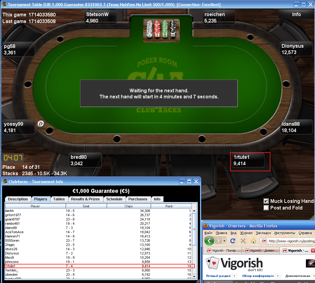 Для тех кто еще не в курсе, организовывается коллективный бэккинг, для игры в хороших турнирах, в целях сплочения рядов, улучшения скилла и наживы денег. Список вкладчиков и суммы (доли) на 21.12.2011г. Порядок расчетов: 1 Взносы участников суммируются и определяется доля каждого по отношению к БР на момент старта турнира (в течение турнира взносы не принимаются) а) Взнос С4А poker учитывается обычном порядке, но вывод средств не допускаеться, а направляеться на увеличение БР копилки (по достижении суммы доли С4А poker е1000 часть, но не больше 30%, может быть использована С4А poker по своему усмотрению). 2 При распределении дивидендов применяются следующие правила: а) Дольщикам выплачивается, согласно долям 30% суммы выигрыша, но не меньше е5 (сумма меньше добавляется к первоначальному взносу (сумме взноса перед турниром-заносом) и увеличивает долю участника при распределении последующих выигрышей) б) 60% идет на капитализацию БР копилки (по достижении суммы в е1000 пропорция может быть пересмотрена в сторону увеличения выплат) в) 10% (и рейкбек) выплачивается игроку или по желанию добавляется во взнос-долю участника. г) Игрок дополнительно премируеться в размере 10% доли С4А poker 3 При уменьшении суммы БР меньше первоначального в 2 раза дивиденды не выплачиваются (кроме 10% игрока) 4 Доля одного пайщика не может превышать 50% от суммы копилки. (в случае превышения производиться автоматическое перечисление денег пайщику. (прим. в случае с С4А poker сумма превышающая порог, распределяется между пайщиками в пропорции равной вкладам на момент превышения) 5 Величина пая не даёт преимущества и привилегий в решении вопросов. 6 При желании выйти из числа пайщиков, участнику выплачивается 100% его доли на момент заявления (заявление не допустимо во время турнира). 7 При переводе денег с использованием платёжных систем, взимающих комиссию за свои услуги соблюдаются следующие правила: а) В случае исполнения обязательных платежей (возмещение игроку затрат собственных средств на БИ, перевод игроком выигрыша в копилку и т.п.) комиссия покрывается денежными средствами копилки. (Например:Fanat при переводе 52е выигрыша, в копилку через вебмани, переводит - €51,59 и платит комиссию €0,41 (комиссия за перевод в ВМ = 0,8%) Пересчёт долей пайщиков в связи с этими потерями, производиться перед выплатой дивидендов или полном расчёте с пайщиком. б) В случае исполнения заявленных платежей (выплата дивидендов, полный расчёт с пайщиком, и т.п.) оплата комиссии производиться за счёт получателя. (Например: Оплата Fanatу приза за занос -7,61 (от которого он отказался, в пользу увеличения своей доли в копилке) если с ВМ: перевожу €7,55 - комиссия €0,06, Fanat получает -€7,55). 8 Сумма по акции "Пополни копилку" зачитываеться так, 50% из выигранной (за минусм БИ) в "благотворительном" турнире суммы идет в увеличение доли игрока, 50% плюсуется, не изменяя величину доли. Рум: С4а Сыграны турниры за ...: Нет Заявки на перевод средств на БИ оставлять не менее чем за 30 минут до начала турнира в ветке. Ссылка для обсуждения: Тема "Коллективный бэккинг Вигориш, предложения путей развития, фан трибуна": /section91/topic6364-80.html Способы связи и просмотра: Бар ----------------------> /bar/ Skype --------------------> Vigorish.ru На данном этапе возможно только через Тимвивер скачать ------------------> http://www.teamviewer.ru Способы внесения денежных средств: E495745385150 Z377663063691 При переводе указывать ник н