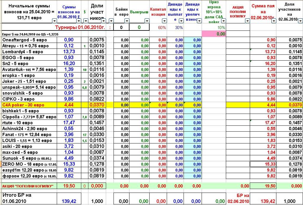 Для тех кто еще не в курсе, организовывается коллективный бэккинг, для игры в хороших турнирах, в целях сплочения рядов, улучшения скилла и наживы денег. Список вкладчиков и суммы (доли) на 21.12.2011г. Порядок расчетов: 1 Взносы участников суммируются и определяется доля каждого по отношению к БР на момент старта турнира (в течение турнира взносы не принимаются) а) Взнос С4А poker учитывается обычном порядке, но вывод средств не допускаеться, а направляеться на увеличение БР копилки (по достижении суммы доли С4А poker е1000 часть, но не больше 30%, может быть использована С4А poker по своему усмотрению). 2 При распределении дивидендов применяются следующие правила: а) Дольщикам выплачивается, согласно долям 30% суммы выигрыша, но не меньше е5 (сумма меньше добавляется к первоначальному взносу (сумме взноса перед турниром-заносом) и увеличивает долю участника при распределении последующих выигрышей) б) 60% идет на капитализацию БР копилки (по достижении суммы в е1000 пропорция может быть пересмотрена в сторону увеличения выплат) в) 10% (и рейкбек) выплачивается игроку или по желанию добавляется во взнос-долю участника. г) Игрок дополнительно премируеться в размере 10% доли С4А poker 3 При уменьшении суммы БР меньше первоначального в 2 раза дивиденды не выплачиваются (кроме 10% игрока) 4 Доля одного пайщика не может превышать 50% от суммы копилки. (в случае превышения производиться автоматическое перечисление денег пайщику. (прим. в случае с С4А poker сумма превышающая порог, распределяется между пайщиками в пропорции равной вкладам на момент превышения) 5 Величина пая не даёт преимущества и привилегий в решении вопросов. 6 При желании выйти из числа пайщиков, участнику выплачивается 100% его доли на момент заявления (заявление не допустимо во время турнира). 7 При переводе денег с использованием платёжных систем, взимающих комиссию за свои услуги соблюдаются следующие правила: а) В случае исполнения обязательных платежей (возмещение игроку затрат собственных средств на БИ, перевод игроком выигрыша в копилку и т.п.) комиссия покрывается денежными средствами копилки. (Например:Fanat при переводе 52е выигрыша, в копилку через вебмани, переводит - €51,59 и платит комиссию €0,41 (комиссия за перевод в ВМ = 0,8%) Пересчёт долей пайщиков в связи с этими потерями, производиться перед выплатой дивидендов или полном расчёте с пайщиком. б) В случае исполнения заявленных платежей (выплата дивидендов, полный расчёт с пайщиком, и т.п.) оплата комиссии производиться за счёт получателя. (Например: Оплата Fanatу приза за занос -7,61 (от которого он отказался, в пользу увеличения своей доли в копилке) если с ВМ: перевожу €7,55 - комиссия €0,06, Fanat получает -€7,55). 8 Сумма по акции "Пополни копилку" зачитываеться так, 50% из выигранной (за минусм БИ) в "благотворительном" турнире суммы идет в увеличение доли игрока, 50% плюсуется, не изменяя величину доли. Рум: С4а Сыграны турниры за ...: Нет Заявки на перевод средств на БИ оставлять не менее чем за 30 минут до начала турнира в ветке. Ссылка для обсуждения: Тема "Коллективный бэккинг Вигориш, предложения путей развития, фан трибуна": /section91/topic6364-80.html Способы связи и просмотра: Бар ----------------------> /bar/ Skype --------------------> Vigorish.ru На данном этапе возможно только через Тимвивер скачать ------------------> http://www.teamviewer.ru Способы внесения денежных средств: E495745385150 Z377663063691 При переводе указывать ник н